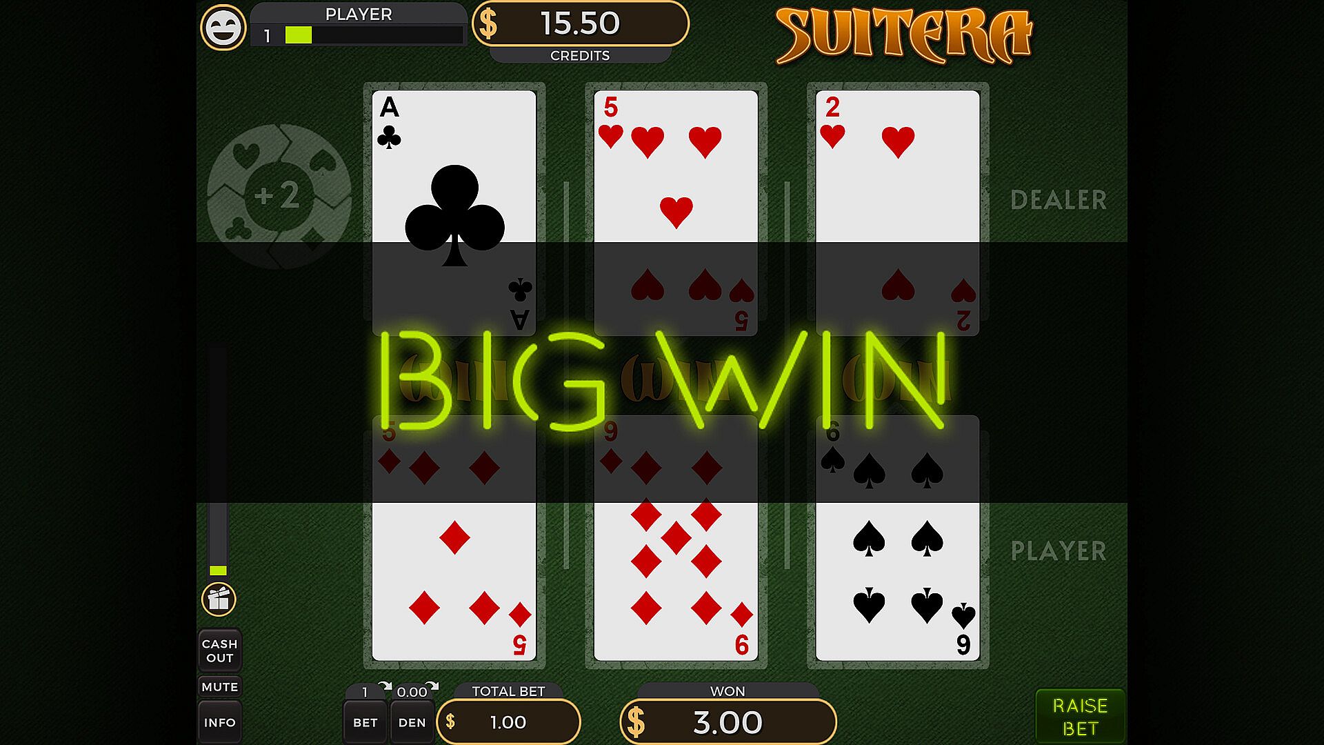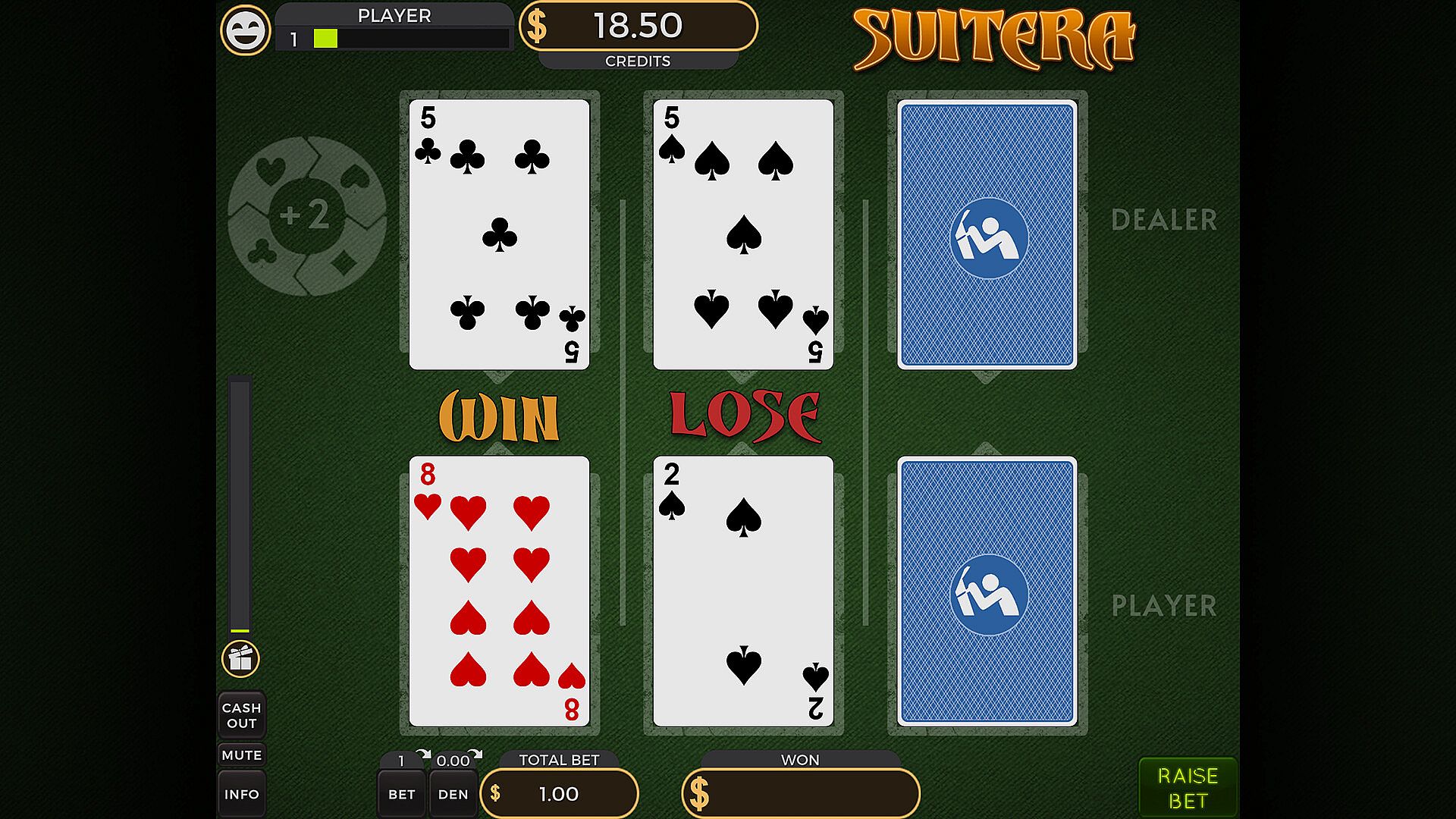 Suitera brings a fresh casino card game to Casino Box. Face cards score 10 points, aces count as 1, and others use their face value. Each suit gains a bonus against another, like hearts adding +2 to beat spades in a matchup. Players buy in for a dollar, reveal the middle lane card, and opt to raise the bet before all three battles play out. The aim stays simple: claim victory in every lane with the higher adjusted value. This casual indie game of chance suits fans of quick, calculated risks on PC.