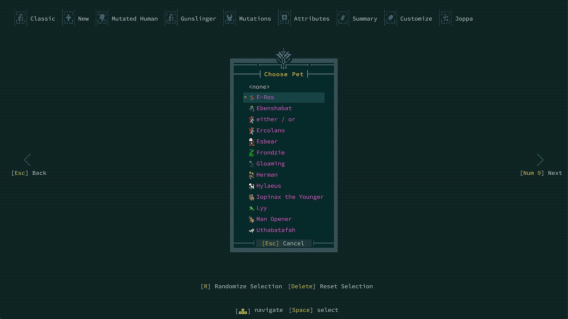 Roasting tortoise shell under the star-ribboned sky or in the darkling vaults of Qud can get lonely. Thankfully, Pets of Harvest Dawn offers thirteen unique companions to keep you company. From the loyal bark of Hylaeus, to the swooning proclamations of E-Ros, to the terrifying astral gaze of Gloaming, you uttering "live and drink" will never go unanswered again.