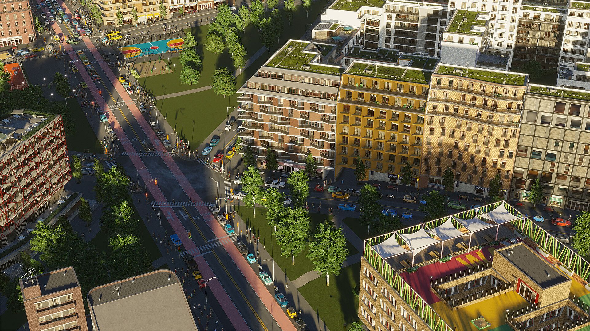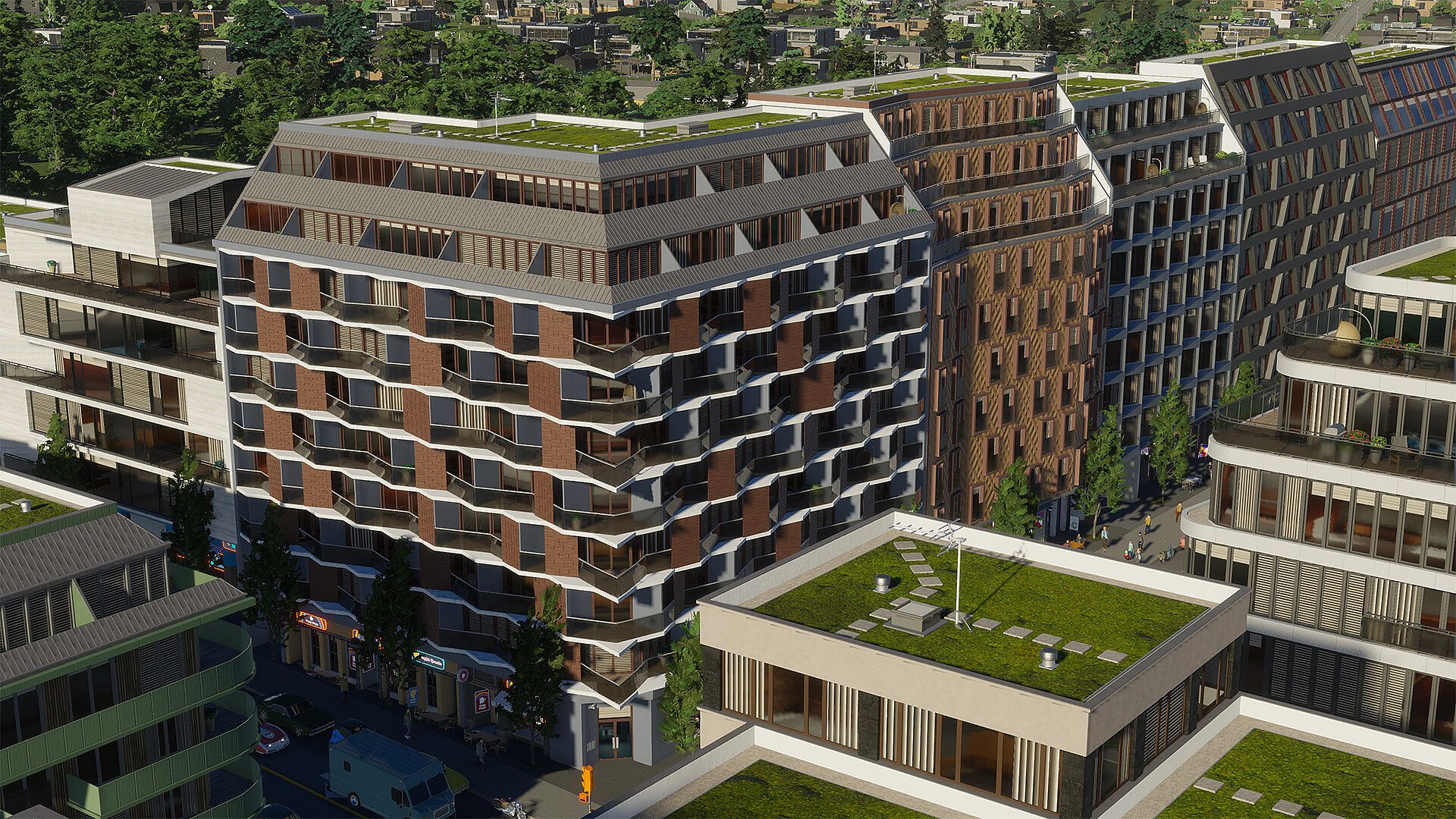 Explore the urban vibe of your city with new mixed housing zone buildings. These buildings have five growable levels and feature commercial spaces on the ground floor and stunning rooftop terraces at the top, creating unique building designs with a variety of lot sizes. Accompanied by urban promenades with expanded sidewalks, tree planters, and cozy seating areas, this pack is perfect for your bustling neighborhood.