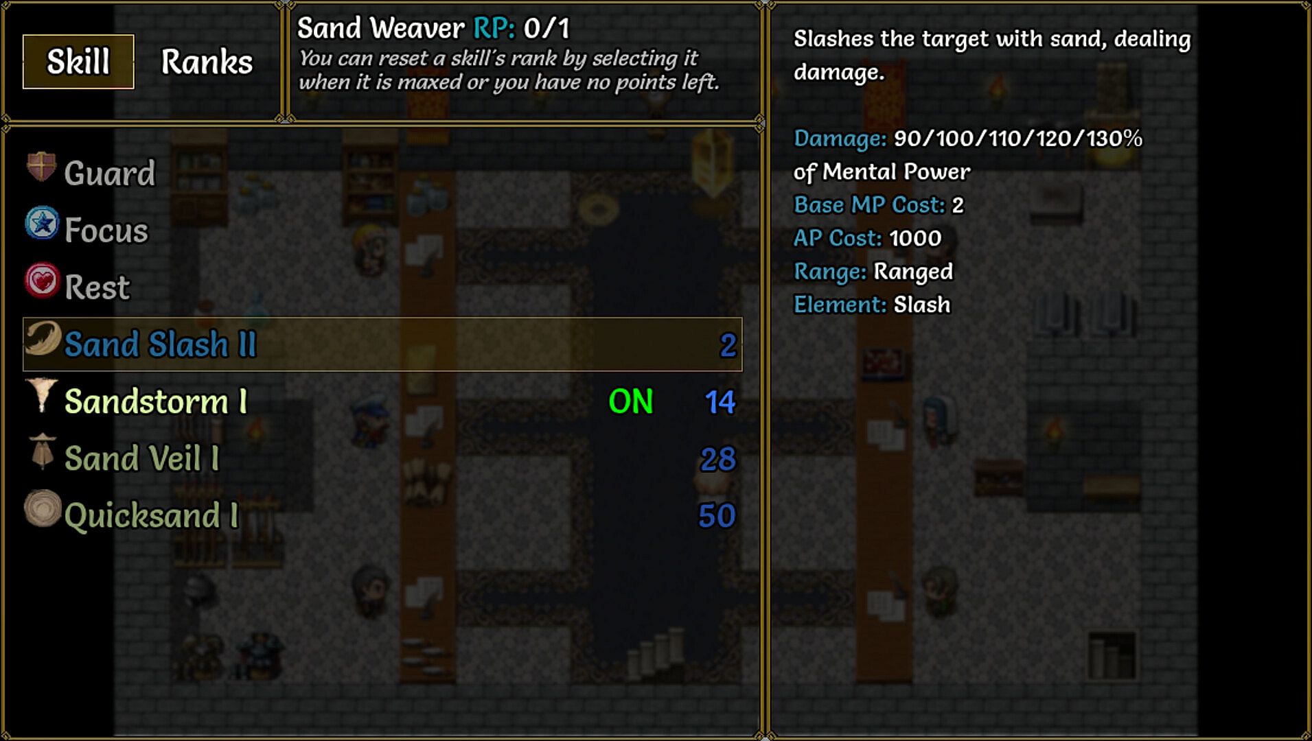 Sand Veil: Cloaks an ally with sand, increasing evasion and damaging attackers.