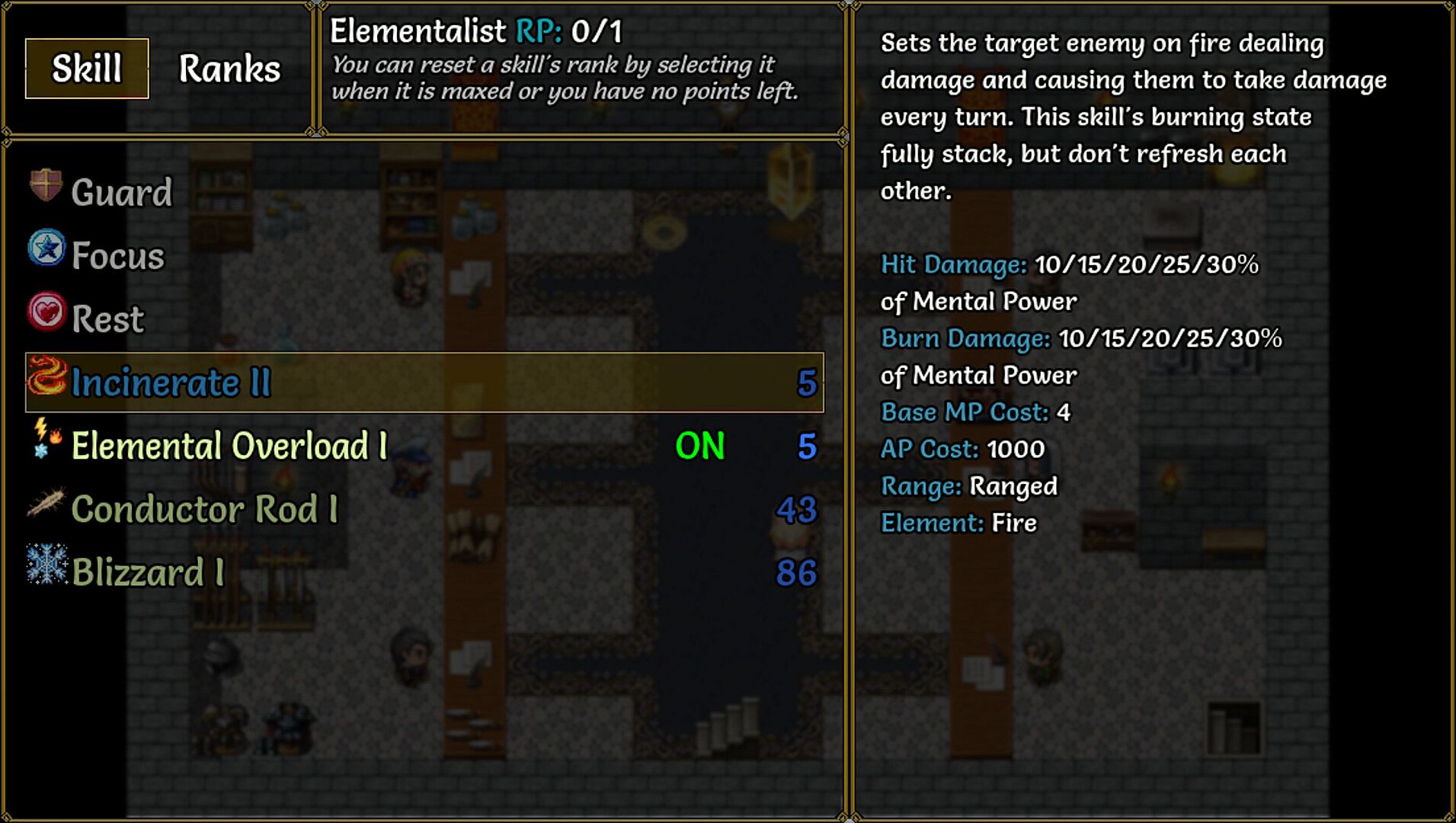 Incinerate: Burns the target enemy and sets them on fire for several turns.