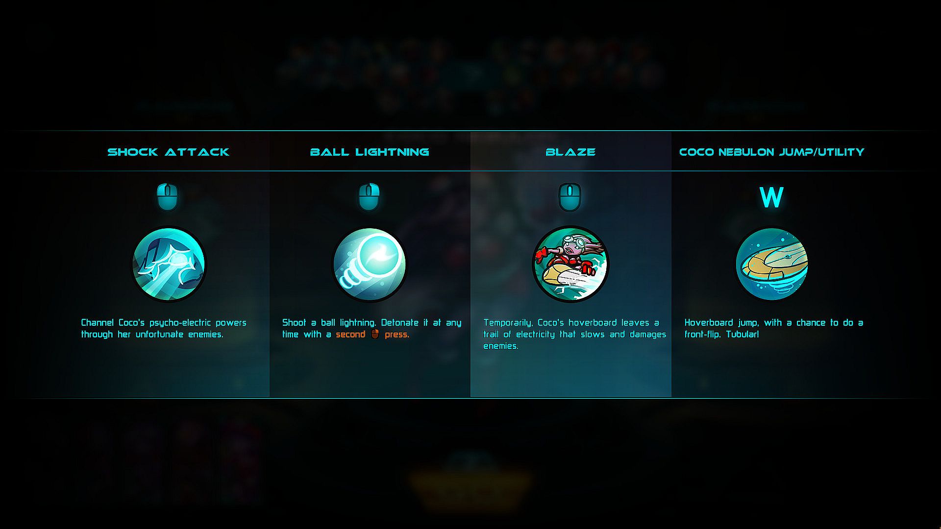 Coco Nebulon is an accessible harasser who can launch a long-range detonatable ball of lightning and can escape from harm using a blazing lightning trail. She comes equipped with the following abilities: