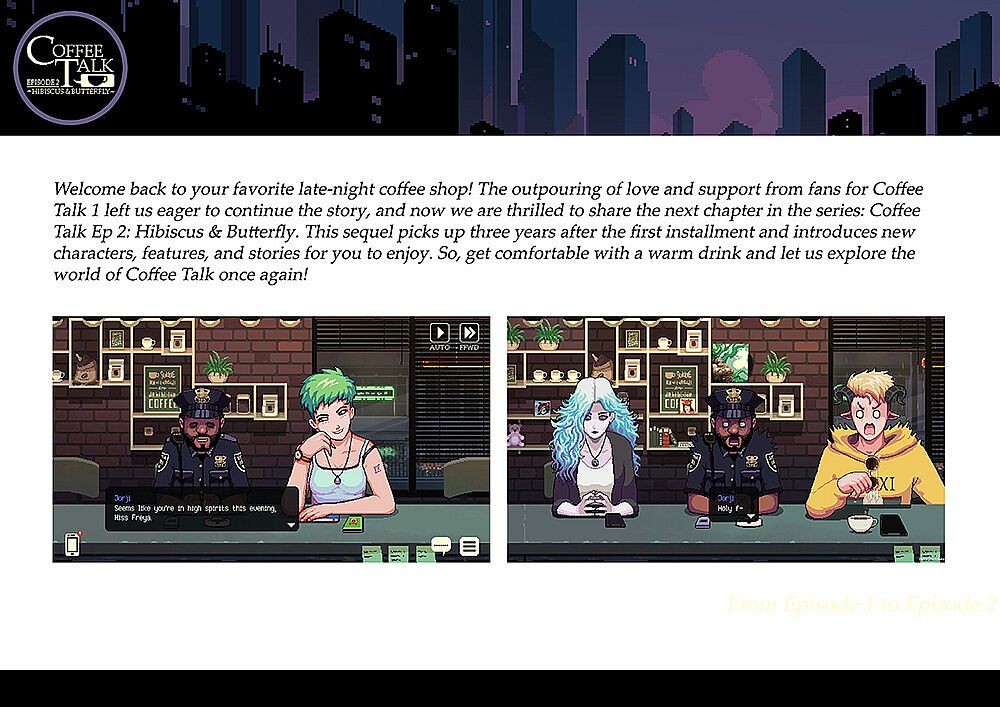 This DLC package contains Coffee Talk Episode 2 - Digital Artbook. A digital PDF artbook containing original artwork and concept art from Coffee Talk's game artists, Dio Mahesa, Hendry Roesly, Kriswin Yuniar, Junkipatchi, and many more.