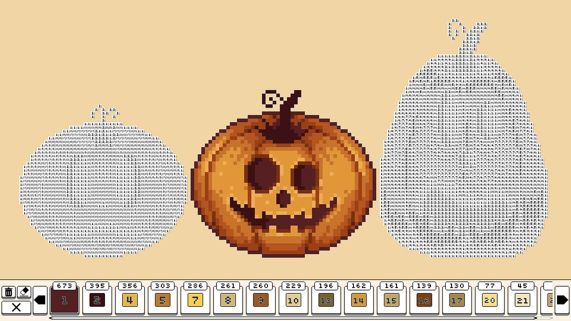 Halloween 5 Book adds 20 spooky levels to Coloring Pixels on PC. This pack brings back Halloween themes with detailed pixel art images in sizes from 24x24 to 150x150. Fill in designs like Jack-o'-Lantern Mushroom, Reaper, Pumpkin Waiter, Bat, and more, including Frankenstein, Werewolf, and Pumpkin House. Casual indie players enjoy the free-to-play pixel coloring loop. Each level reveals a unique Halloween image as colors come together. Perfect for relaxed creators who love thematic pixel art.