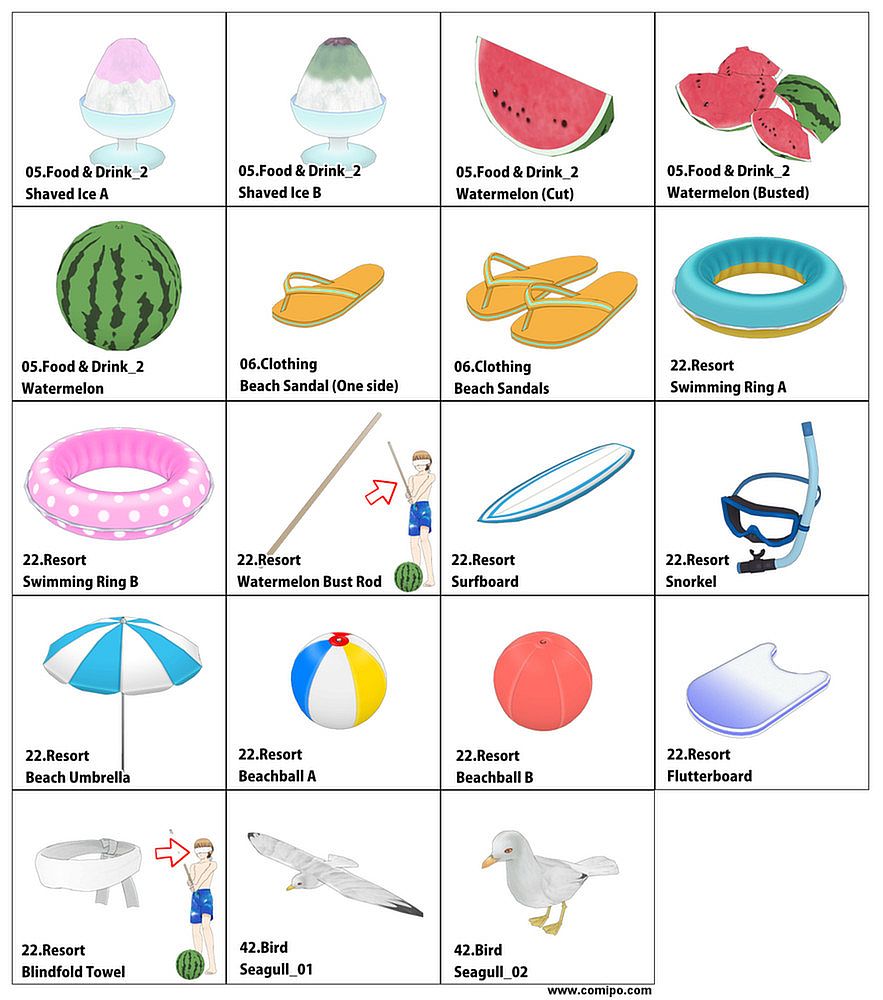 ComiPo! Swimwear collection is filled with bits and pieces you'll need to create the perfect beach scene. A large variety of swimsuits ensures that your manga characters will have the swimsuit look that suits their personality. From swimmer essentials such as inflatable swimming rings and snorkels to summer foods such as watermelon and shaved ice, this collection includes all the essential props you will need to bring your scenes to life.