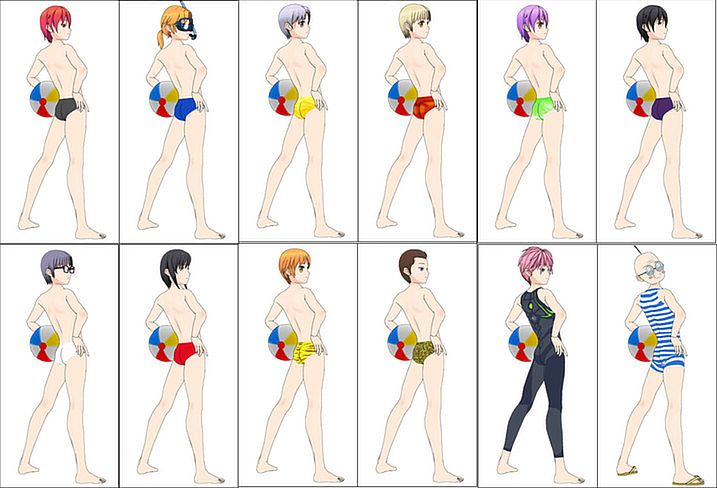 • 24 variations of swimming trunks and briefs for males.