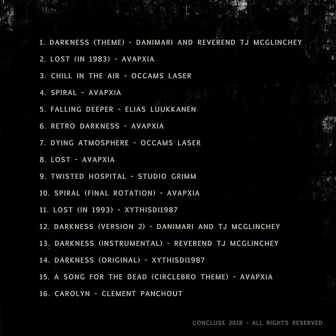 The official CONCLUSE soundtrack captures the essence of its action-adventure indie roots with tracks from Occams Laser, AvapXia, Elias Luukkanen, Studio Grimm, DaniMari, Reverend TJ McGlinchey, Xythisdi1987, and Clement Pancout. Titles like Darkness (Concluse Theme), Lost (in 1983), Spiral, and Twisted Hospital evoke a retro-dark atmosphere across 16 pieces. Variations such as Darkness (Version 2), Darkness (Instrumental), and Spiral (Final Rotation) add depth to the moody soundscape.