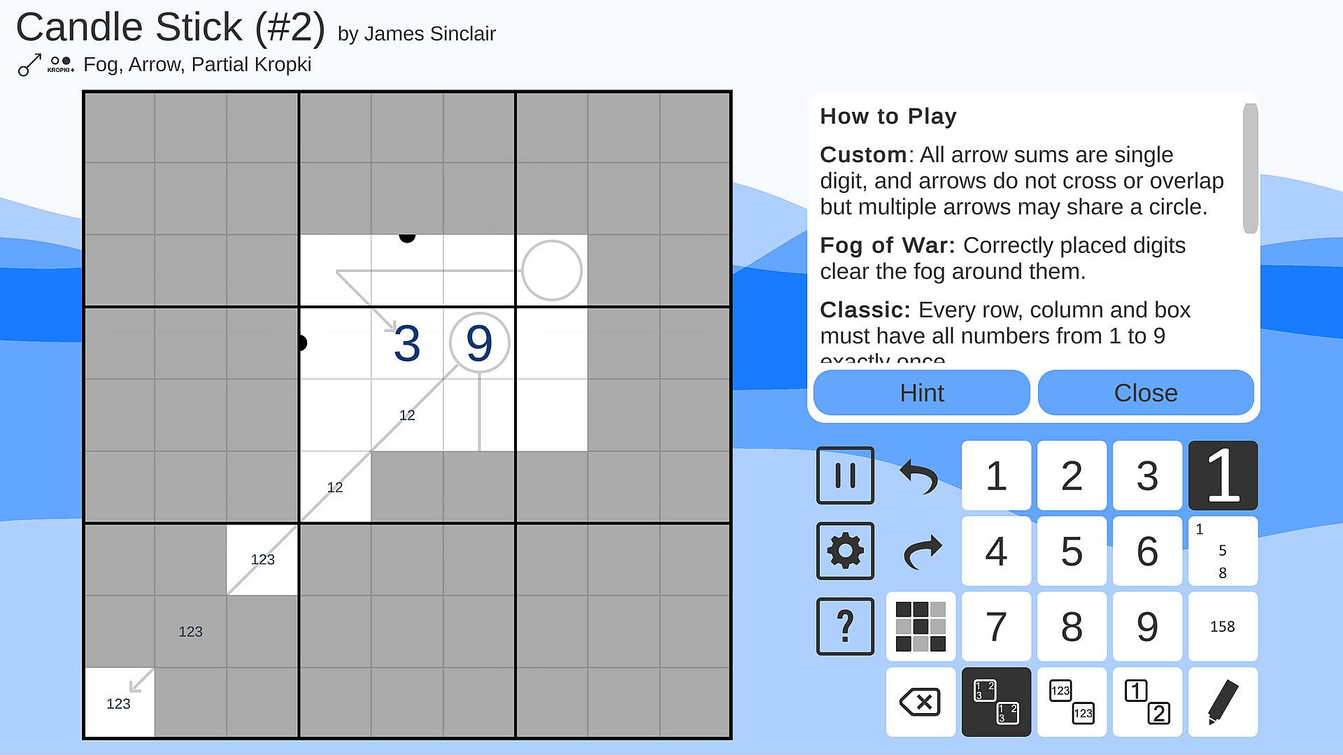 It is obvious why this development could not occur when sudoku was largely on paper, but technology and apps have changed all that. We are delighted to bring you our very own Fog-of-War pack now, featuring puzzles by some of the keenest minds and cleverest constructors there are. The sheer variety of uses of fog in this pack will amaze you.