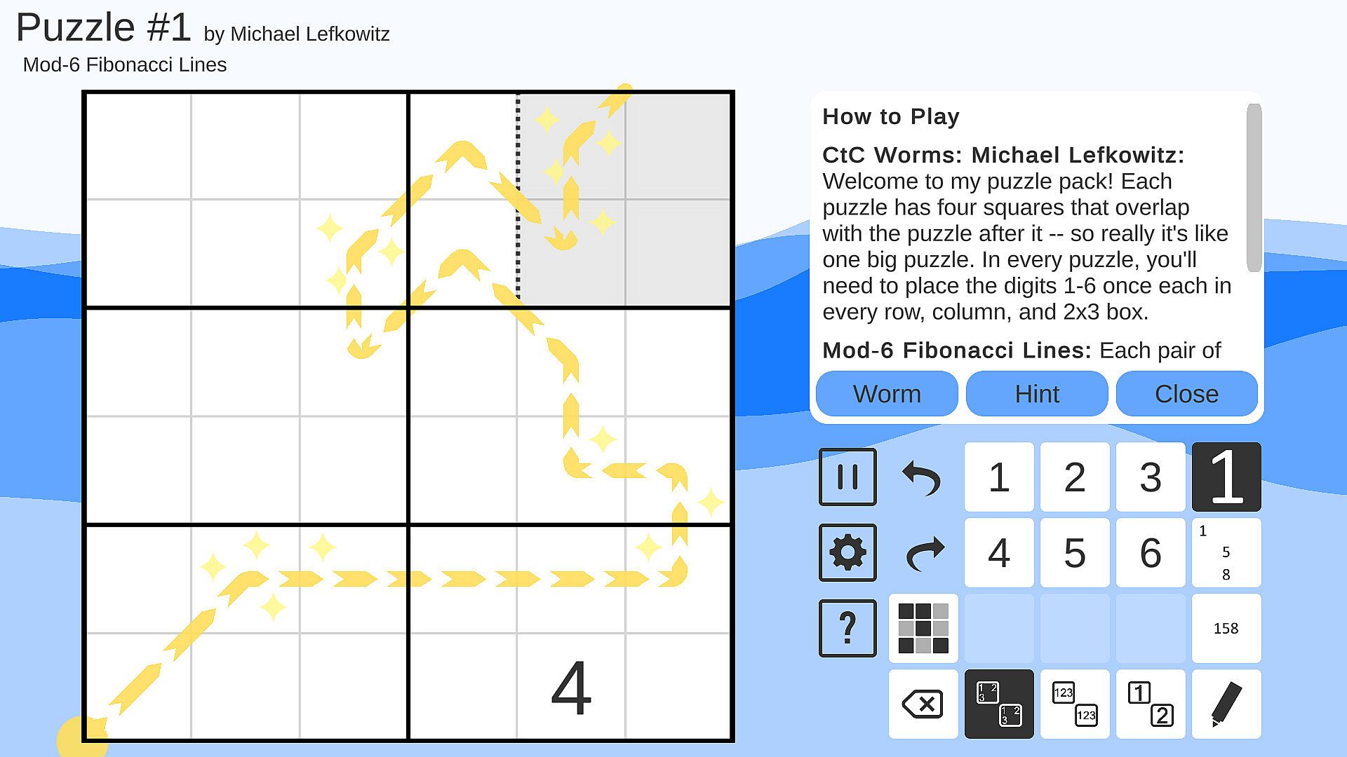 Michaelās worm consists of nine 6x6 puzzles, connected by a unique and intriguing line constraint, as well as digits between the puzzles.