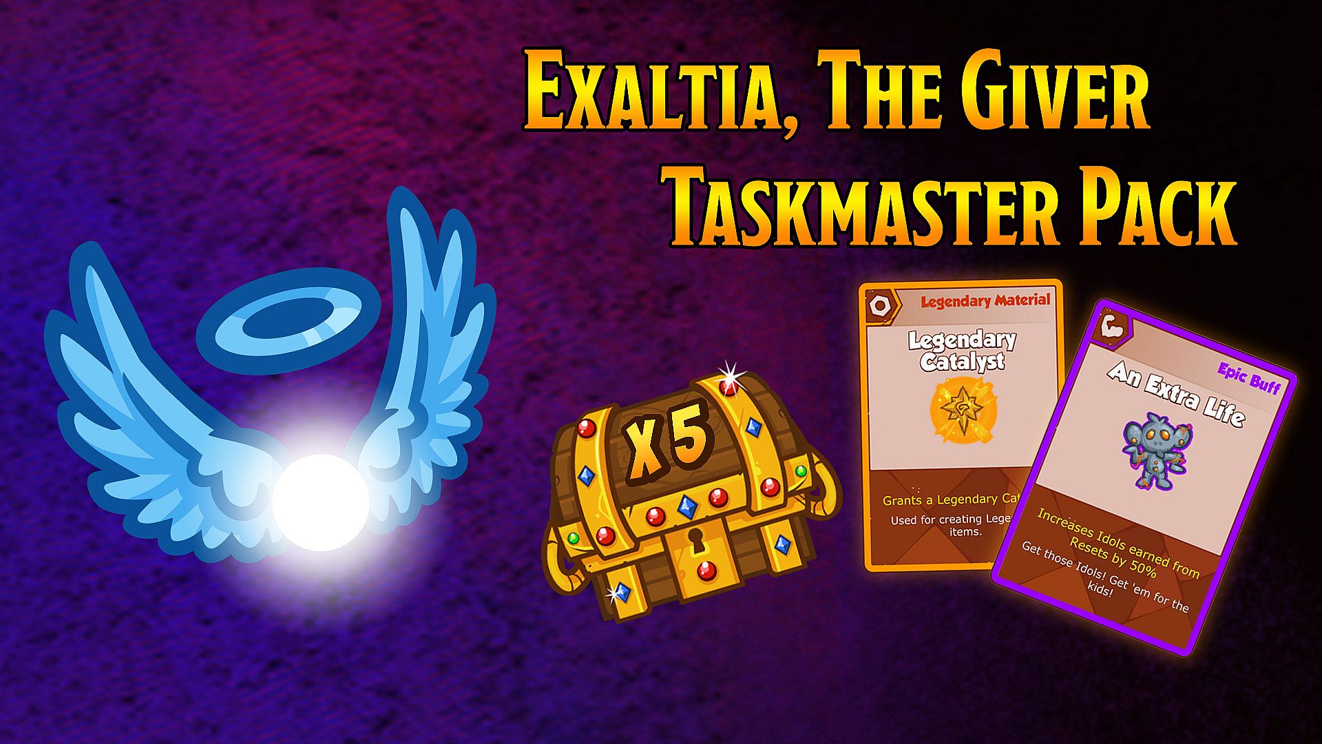 Taskmasters are helpers who can automate parts of the game. Assign them to click monsters, level Crusaders, or use abilities, to save your precious energy! This pack unlocks the Exaltia, the Giver taskmaster.