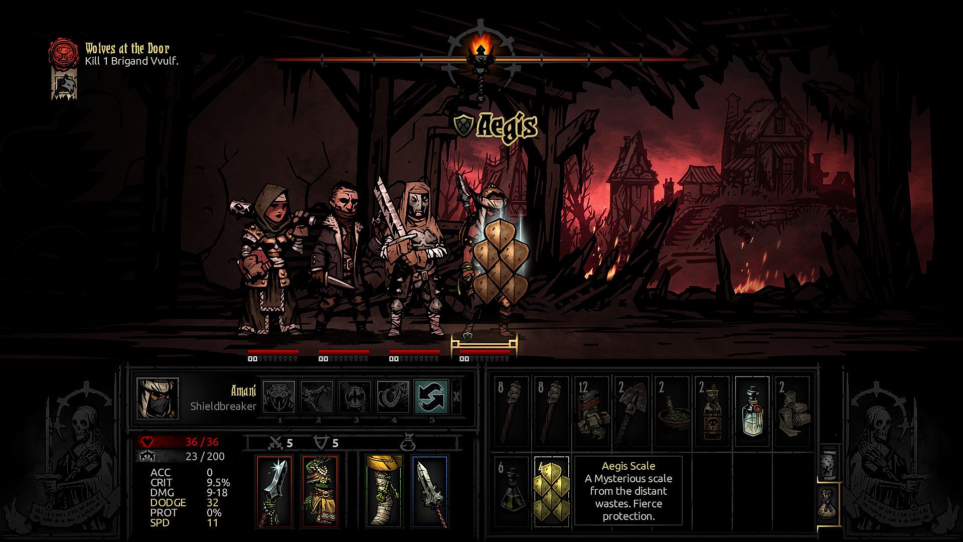The Shieldbreaker is a powerful ally in the fight to reclaim the Estate and banish the evil that squats in the Darkest Dungeon. A highly-tactical hero with solid damage dealing capability, she truly excels when countering monsters with high protection and those who guard their allies. Her movement, speed, and targeted abilities make her a valuable ally for dismantling intractable monster groups. Though relatively low health, the Shieldbreaker is yet highly survivable in short bursts thanks to her Aegis shield.