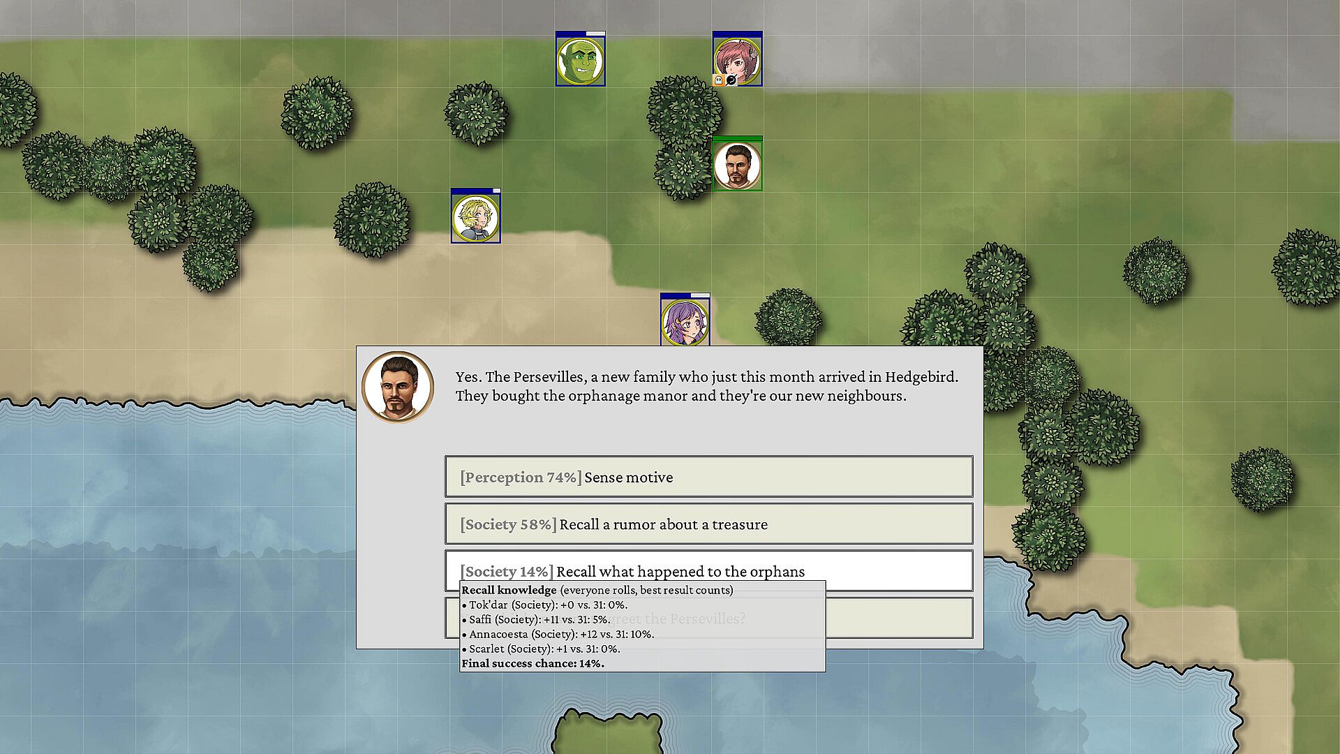 In a bit of an experiment, this adventure makes much heavier use of skills and dialog than before. Make skill checks to recall knowledge, sense motive, convince others in conversation or take special actions, both in-combat and out.
