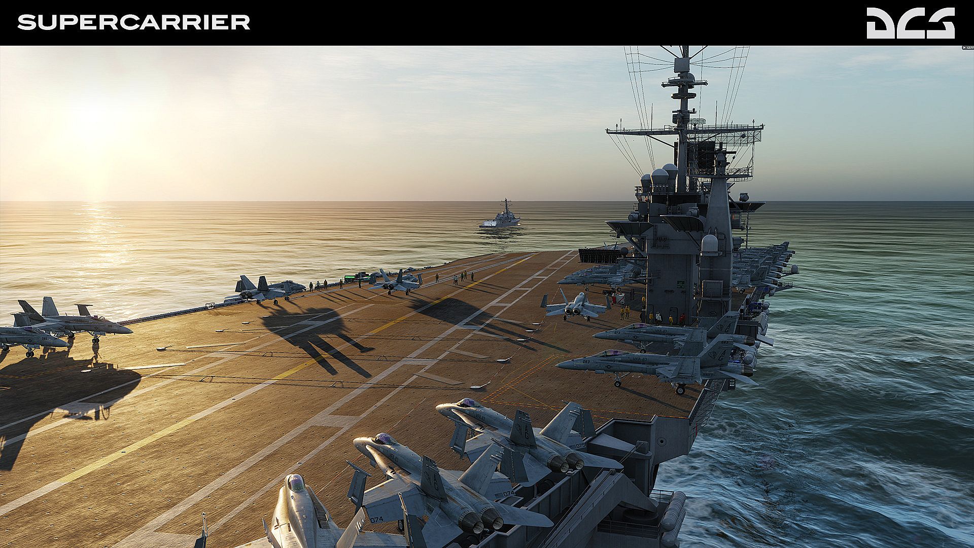 DCS: Supercarrier is the most detailed and realistic simulation of a Nimitz-class aircraft carrier ever created. A Nimitz-class aircraft carrier is a nuclear-powered fortress at sea with a crew of over 6,000 sailors and airmen. The angled flight deck with arrestor wires and four steam-powered catapults support air wing operations of up to 90 aircraft. The ship also includes a formidable air defense system that includes the RIM-7 Sea Sparrow Missile and RIM-116 Rolling Airframe Missile (RAM) missiles, and Close-In Weapon System (CIWS) gun system. A Nimitz-class aircraft carrier is the ultimate power projection weapon.
