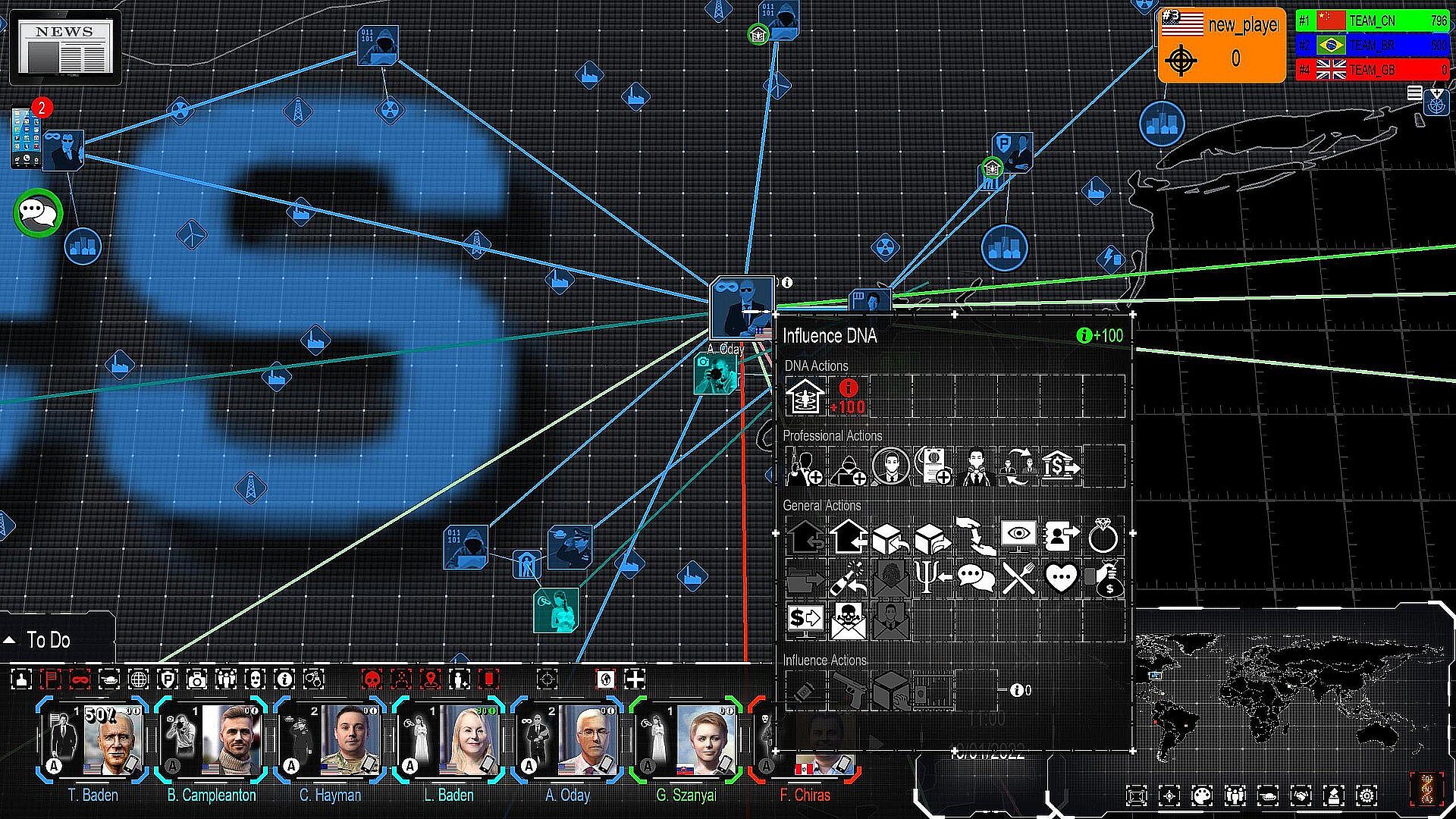 Enabled at any time during the game, the DNA mode modifies the interfaces and map to allow you to directly edit data and view normally secret items. While active, each character's relationships are indicated by links between them and their contacts on the map, and editable data will be highlighted in the many interfaces.