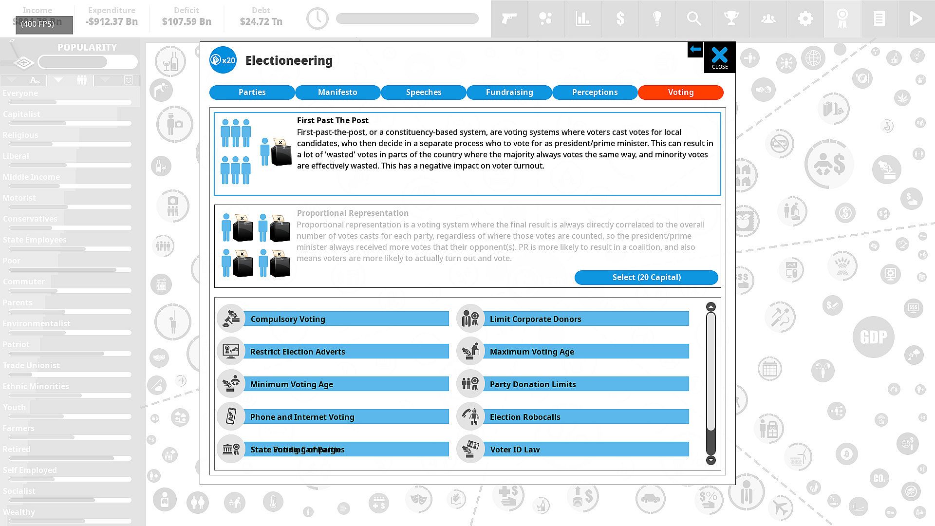 Only part of winning an election is really about running the country well. Democracy 4 - Voting Systems introduces a whole bunch of new policies that let you decide who can vote, how they vote, and how easy it is for big money to swing an election. This expansion pack includes the following policies: