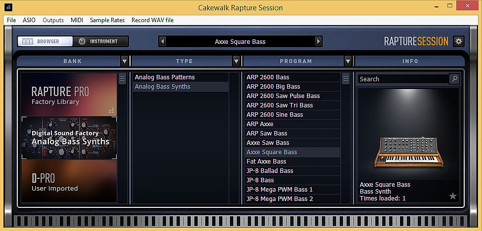Rapture Session virtual instruments (available in VST3/AAX/standalone formats). This sound expansion features amazing classic analog synthesizer bass sounds including ARP, Moog, Prophet, Jupiter, Juno, JX8P, and more. Utilizing the powerful Rapture synthesizer engine, sound parameters are mapped to real time controls allowing for quick custom edits. Programs include the authentic sounds as well as combinations designed to add analog richness and fatten up the bottom.