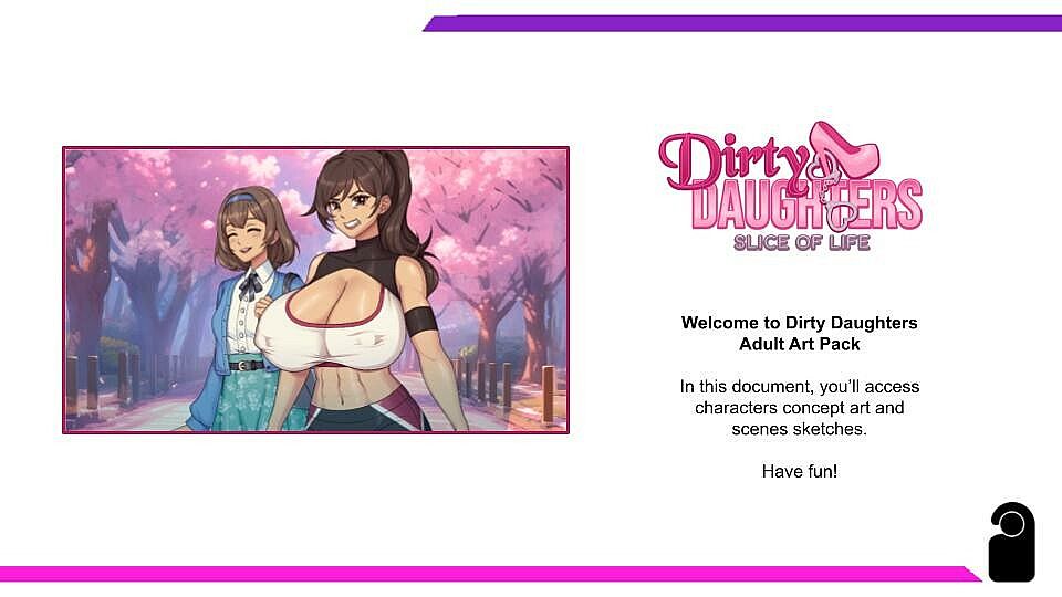 Get a close look at the H-scenes from Dirty Daughters: Slice of Life through this adult art collection. It delivers a PDF packed with every in-game H-scene, plus backstage insights like character sketches and the full art creation process. Access the file right from your PC installation at the specified Steam directory. This casual simulation add-on lets fans explore the visual side of the game in detail. It highlights sketches from scenes and character development stages. Perfect for players who enjoy studying art workflows in adult-themed simulations.