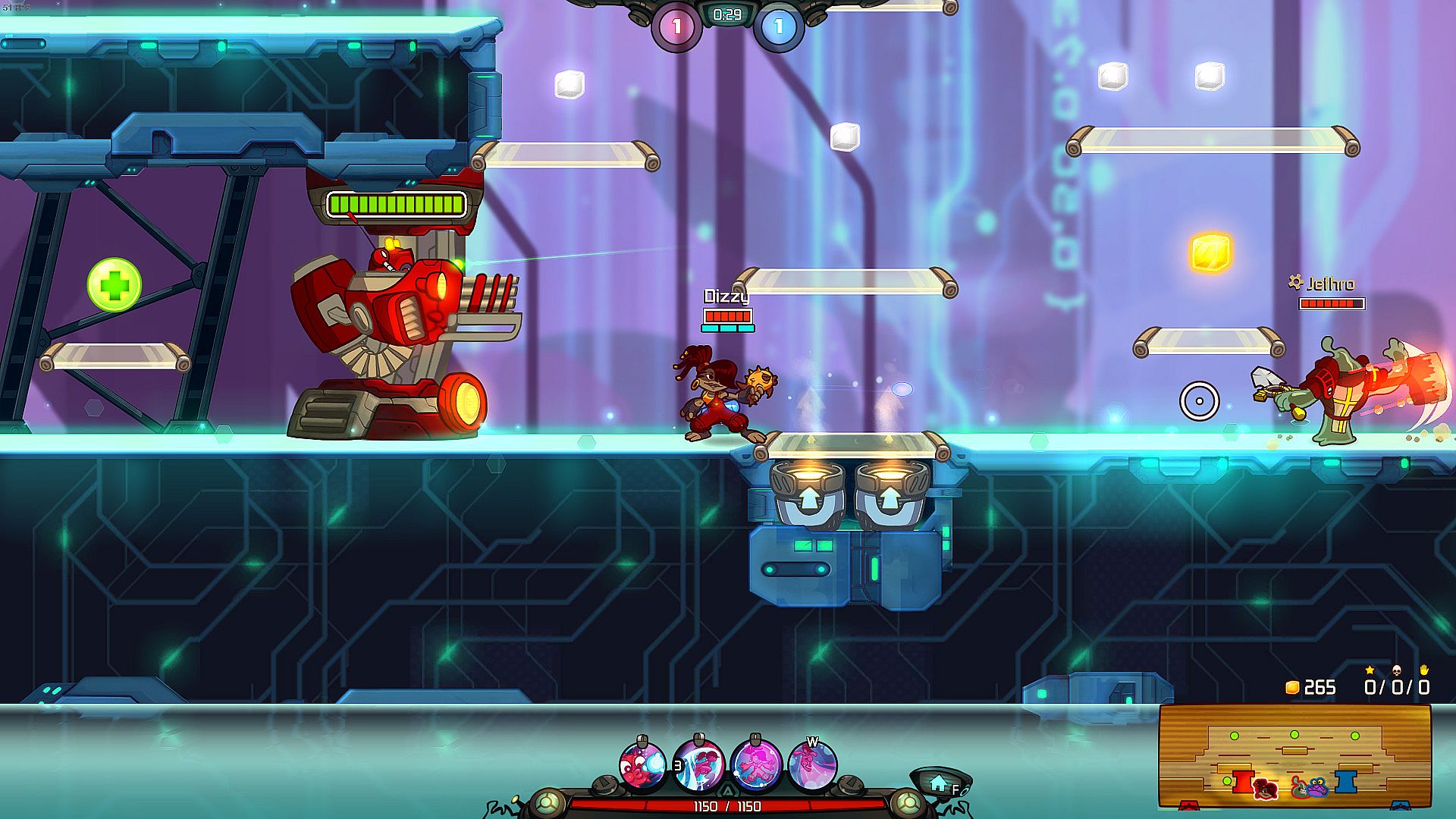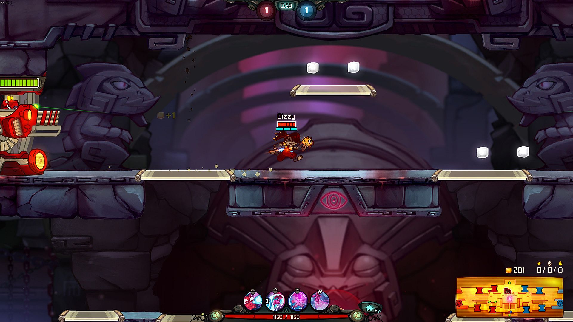 Dizzy is a moderately challenging fighter that dashes around quickly by using multiple, stackable dashes. She can leave an explosive clone which deals damage in an area when it explodes, and comes equipped with the following abilities: