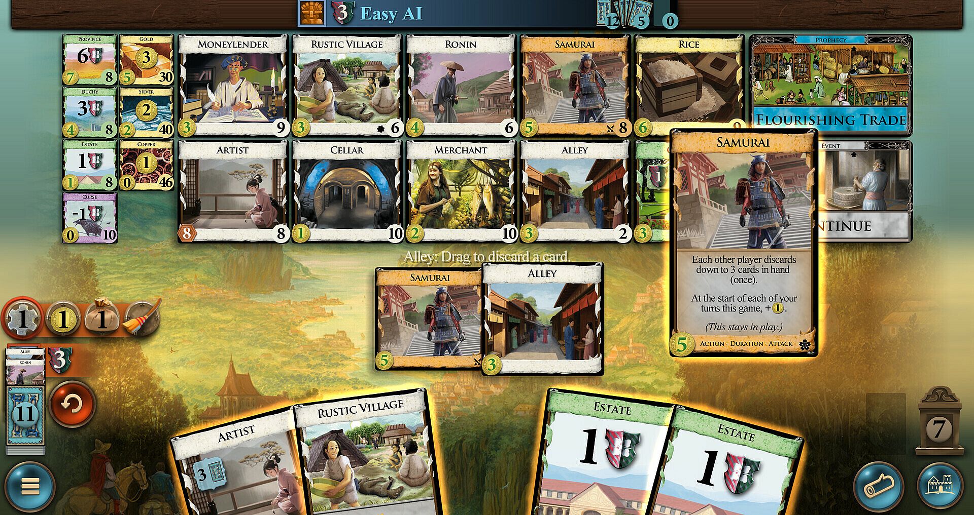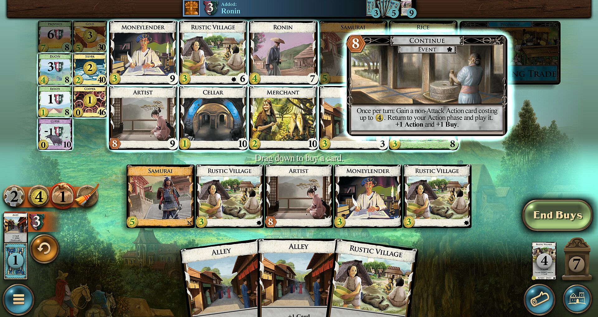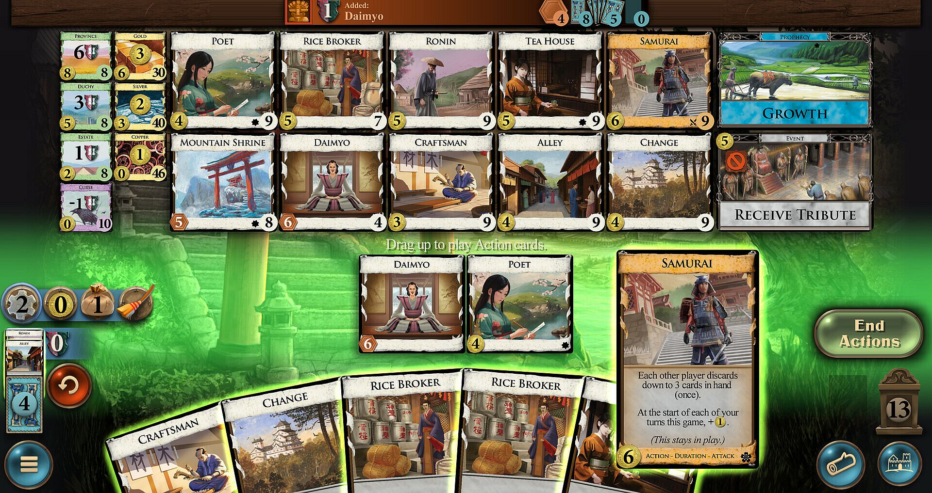 The feudal Japan expansion. Debt returns, now with on-play debt; Events also return. Prophecies are rules changes that will happen sometime in the future, after enough Omens are played; Shadow cards can leap into play from the bottom of your deck.