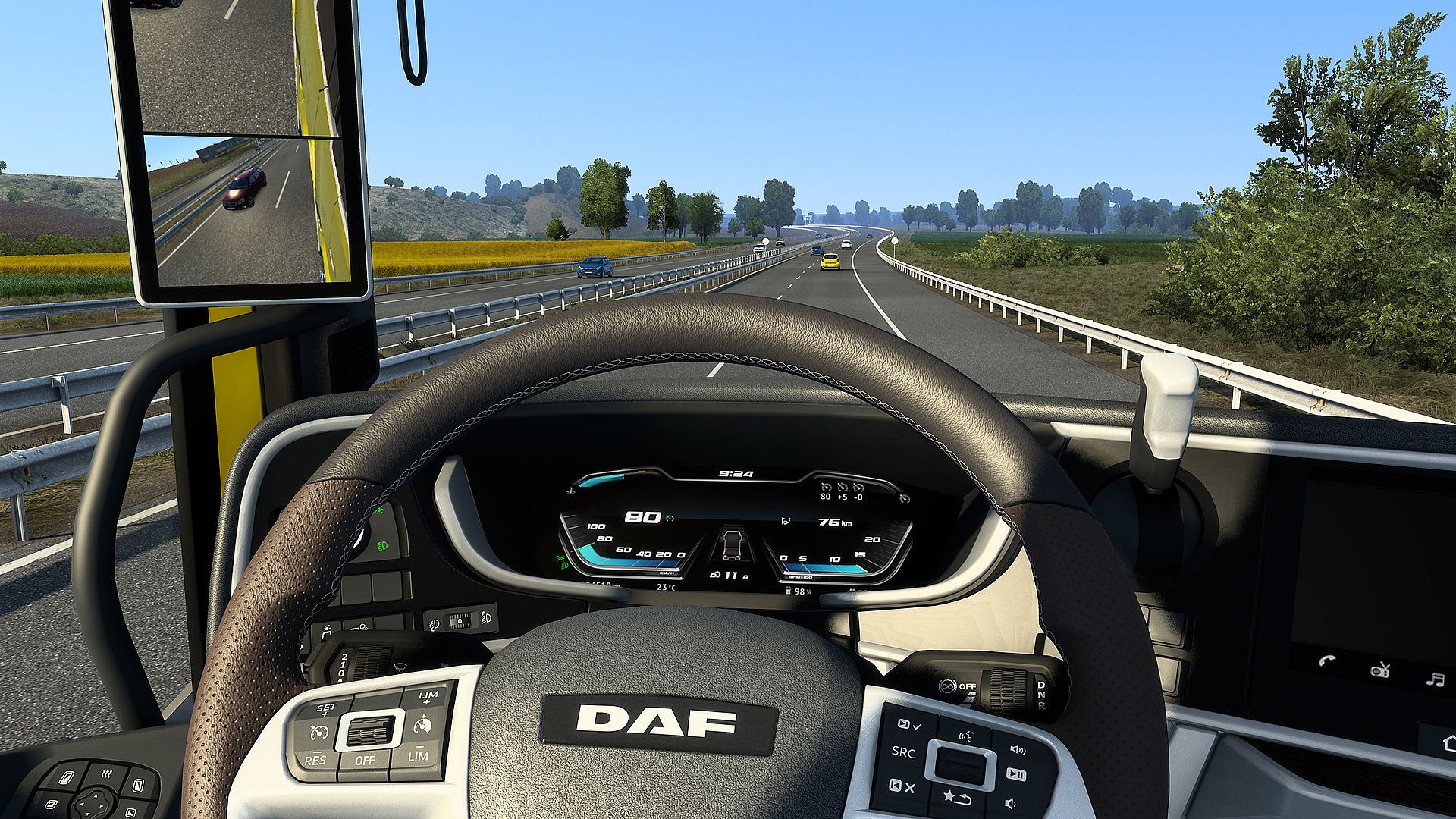 Another first for Euro Truck Simulator 2 with the new DAF is its fully-digital dashboard display, or Driver Information Panel (DIP), as DAF calls it. The DIP features modern graphics and a unique design which is bound to make the truck stand out from its competitors, and make your driving experience more interesting and informative.