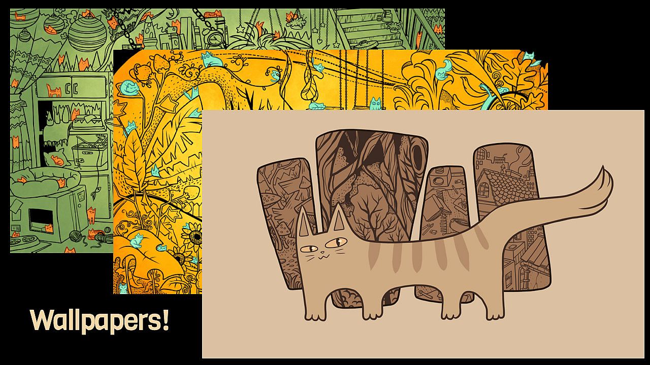 - Wallpapers. These are the colored pages, with the cats shown! They double as a guide for cat locations too. Also includes the menu and cover art.
