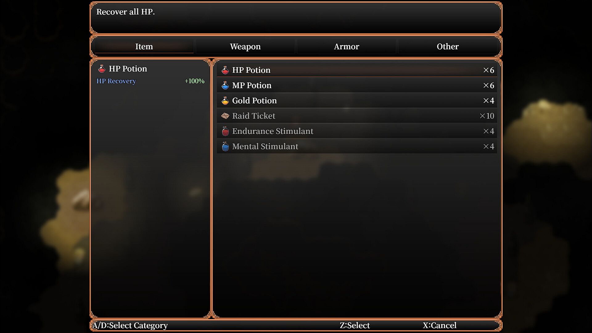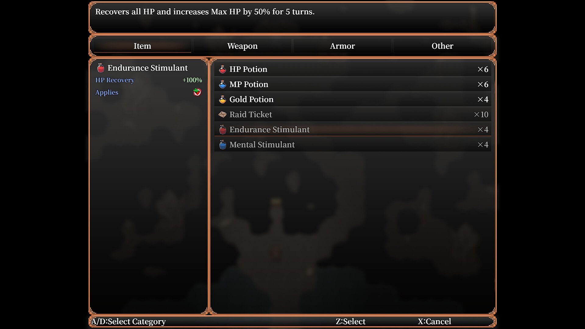 4x Endurance Stimulant (Recovers all HP, increases Max HP by 50% for 5 turns)