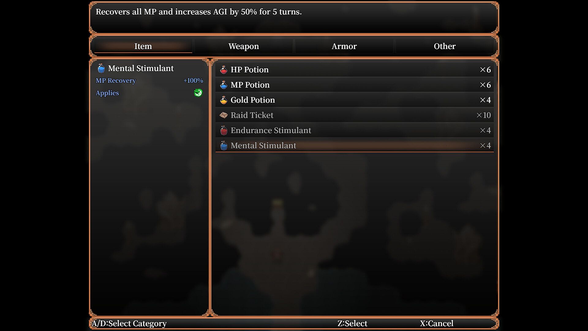 4x Mental Stimulant (Recovers all MP, increases AGI by 50% for 5 turns)