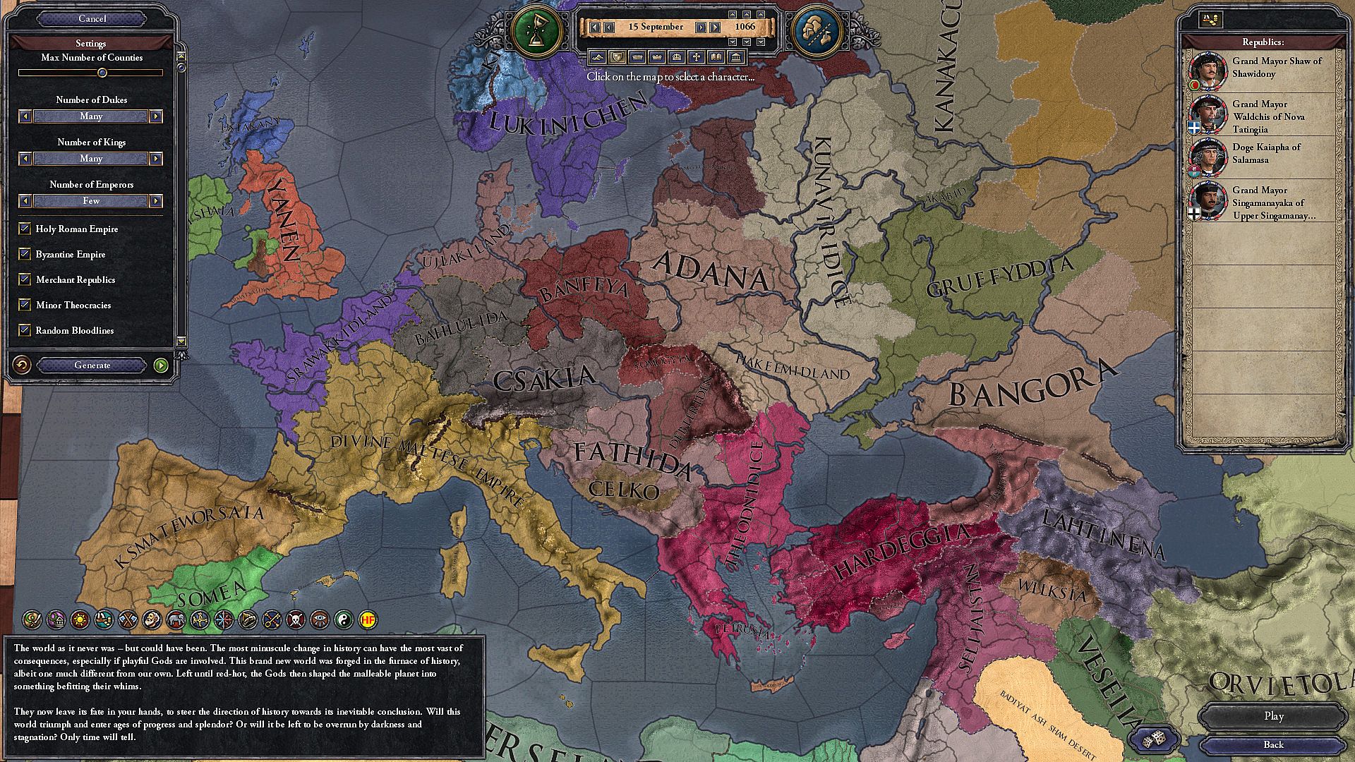 Start your game on a fictional map of Europe as a small realm fighting for space, or on a random map with historical analogues for the great kingdoms of yore.