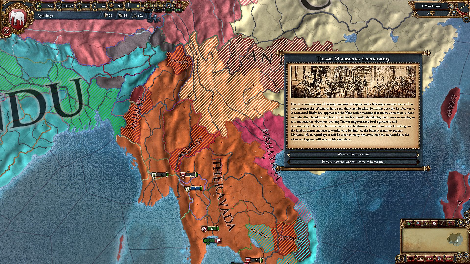 New mechanics for Protestants and Buddhists deepen the religious gameplay. Protestants acquire the ability to create their own national church by gaining religious tradition, whilst Buddhists must maintain balance between high and low karma (high karma ruler becomes detached from the world, while a low karma ruler loses trust of their soldiers).