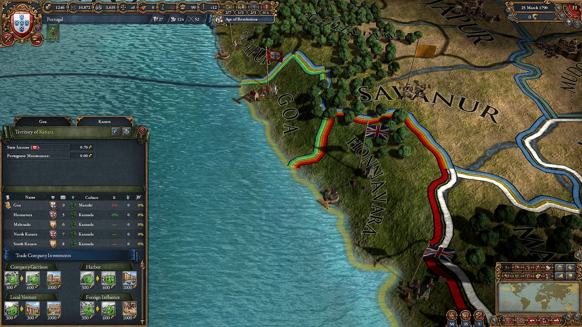 Upgrade and improve the provinces tied to your trade companies, conferring bonuses both to the European master and neighboring Indian nations.