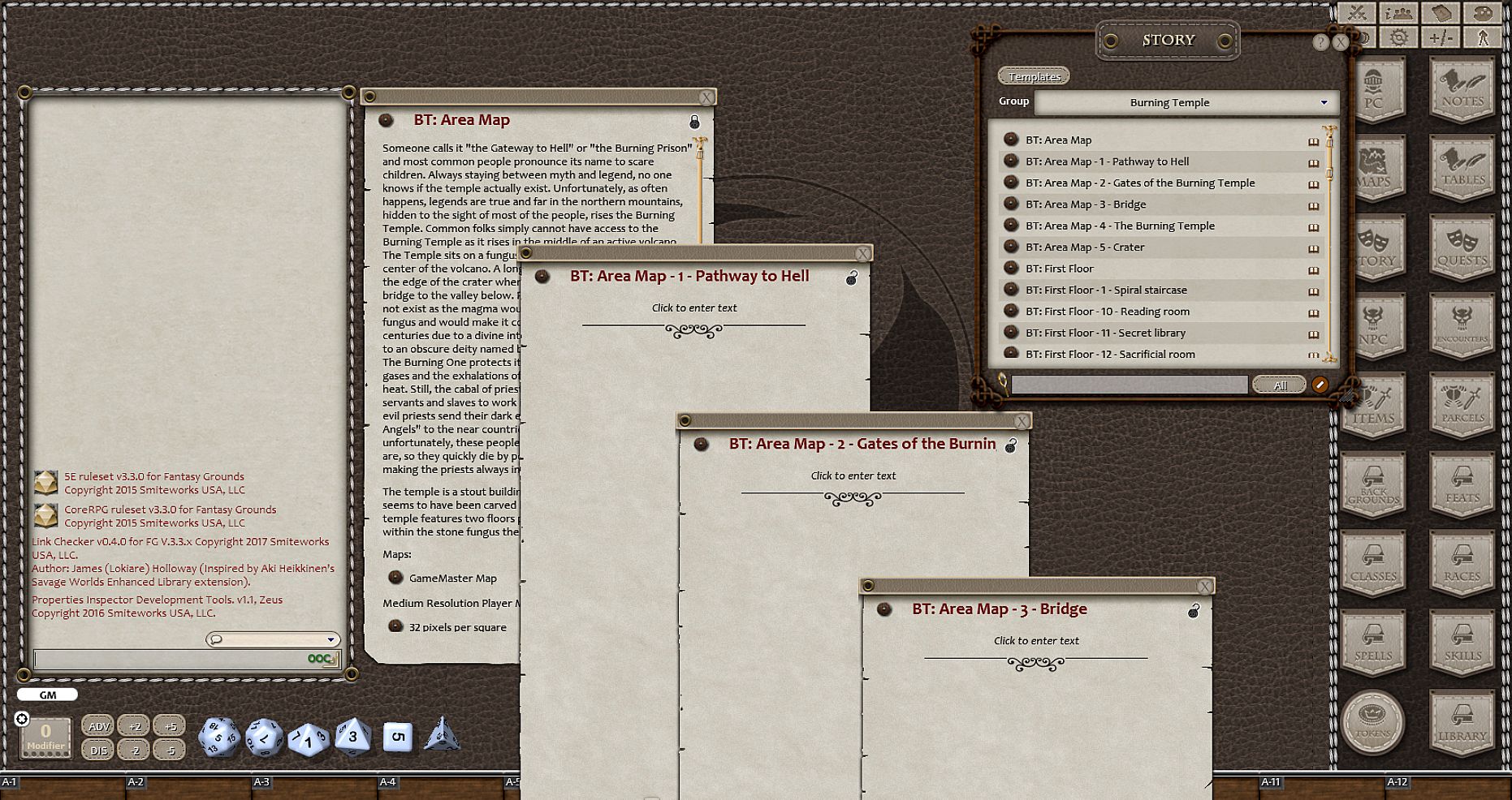 The map module has been carefully organized to allow the GM the easily prepare adventures within multiple campaigns simultaneously, while still allowing maps modules to be opened or closed as needed. Each map is linked within a an easy to follow outline story entry, with links to the map in mutliple resolutions.