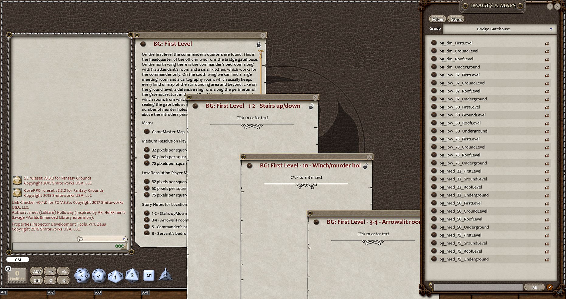 The map module has been carefully organized to allow the GM the easily prepare adventures within multiple campaigns simultaneously, while still allowing maps modules to be opened or closed as needed. Each map is linked within an easy to follow outline story entry, with links to the map in mutliple resolutions.