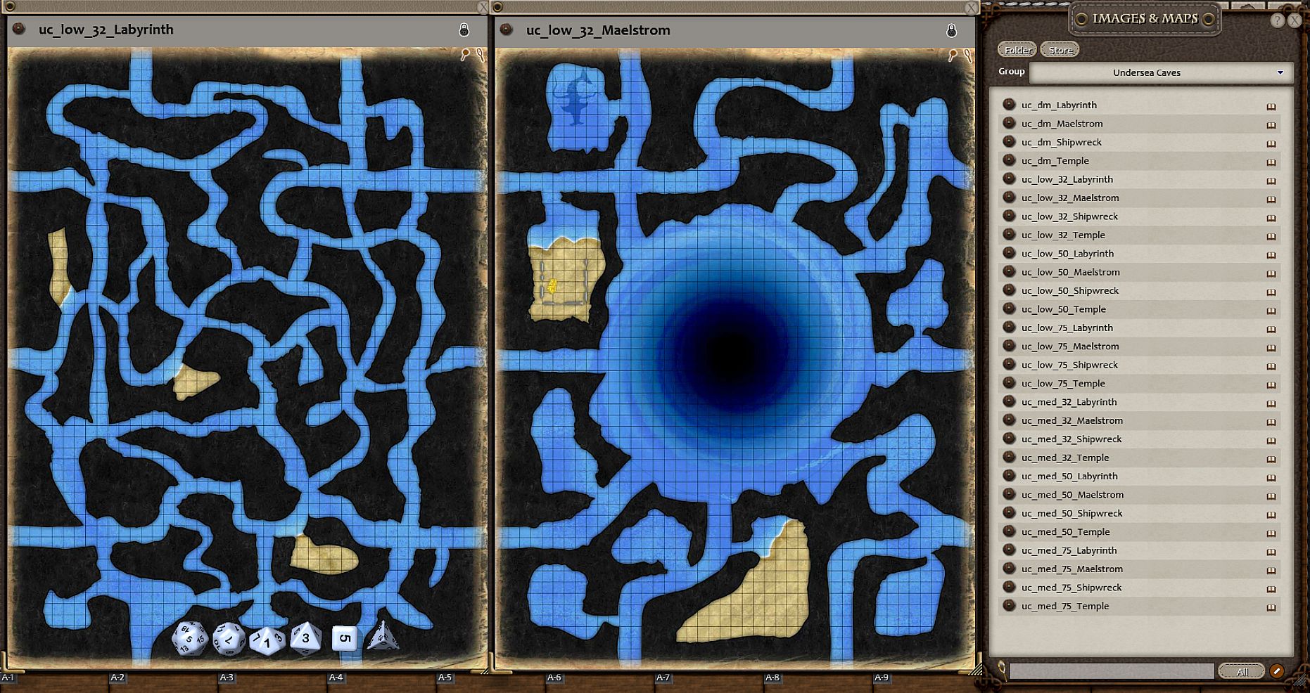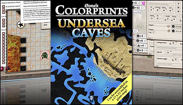Undersea Caves presents four color maps you can arrange as you wish to form a larger map. You can event print more than one copy of the same map in order to obtain a bigger map.