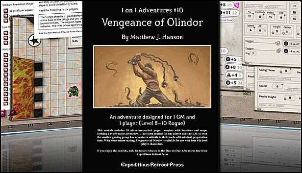 Vengeance of Olindor1 on 1 Adventures #10: Vengeance of Olindor is an adventure-packed with locations and maps, forming a ready-made adventure. It has been crafted for one GM and one player (Level 8-10 Rogue). With some minor scaling, Vengeance of Olindor is suitable for use with four 6th level player characters.