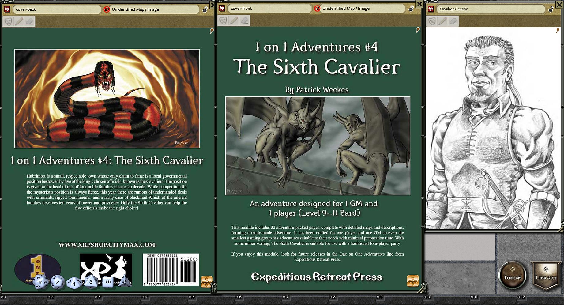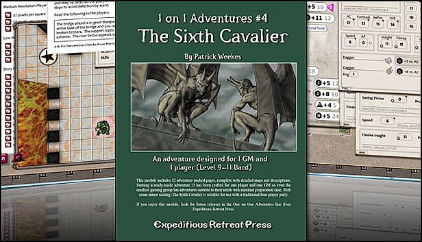 This module is converted from 32 adventure-packed pages, complete with detailed maps and descriptions, forming a ready-made adventure for the smallest gaming group. Although it is designed for a Bard or Rogue level 9-11, with some minor scaling, Sixth Cavalier is suitable for use with a traditional four-player party.