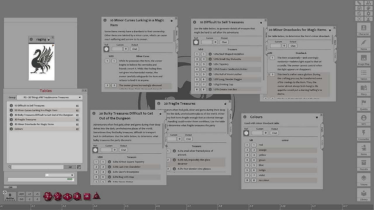 - 5 rollable tables with detailed text describing Troublesome Treasures