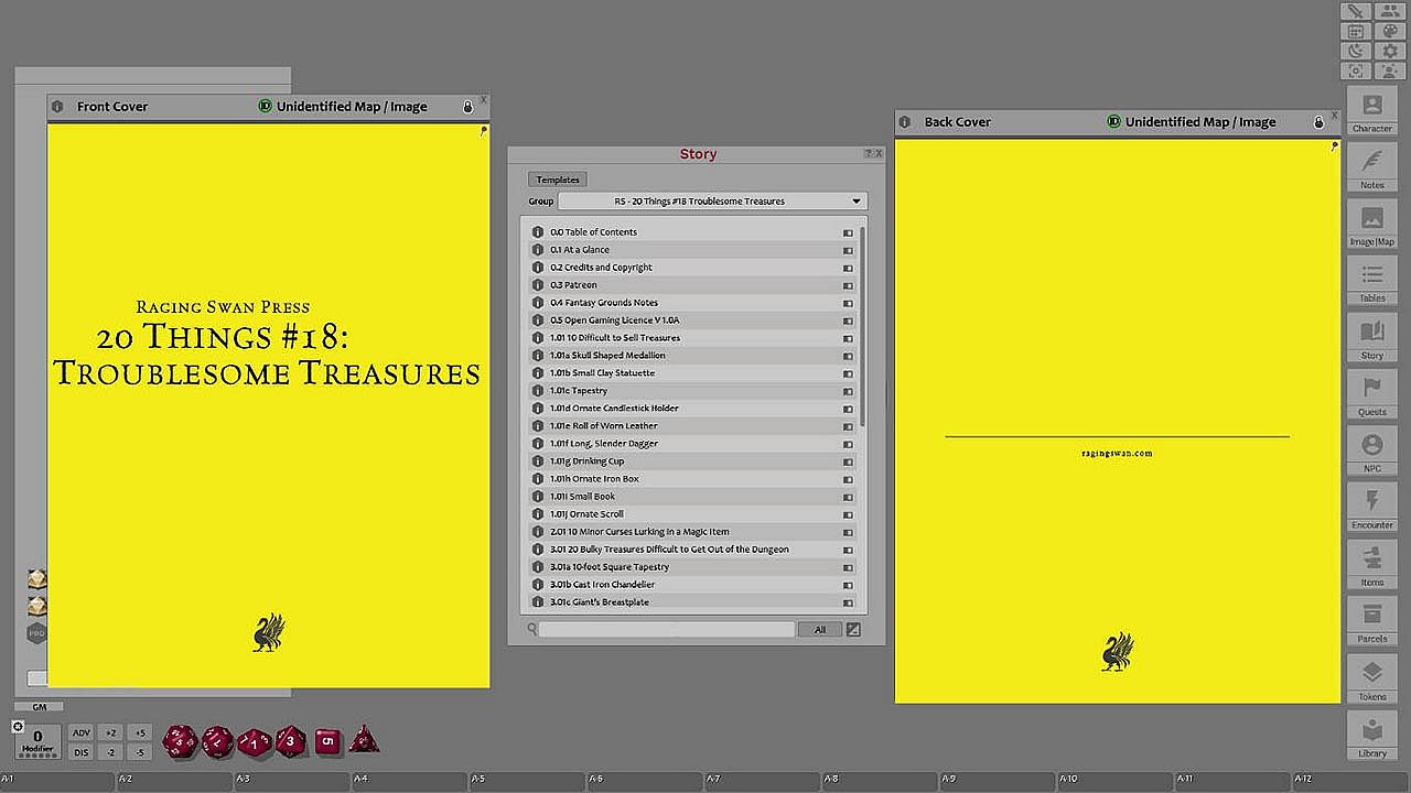 Use the material herein either before or during play and bask in your players' adulation. This instalment provides five tables designed to help you flesh out and bring to life the troublesome treasures in your campaign! Fully converted to Fantasy Grounds and usable in any system.