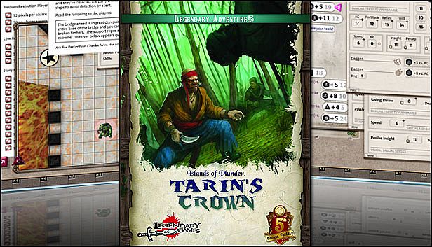Islands of Plunder: Tarin's Crown is a 26-page 5th Edition adventure for 6th-level PCs fraught with harrowing battles on land and aboard ship, through treacherous terrain against even more treacherous foes. It includes two sets of maps, one for the GM an unkeyed set for players, , and can be easily dropped into any seafaring 5E campaign, whether in a published pirate setting or a campaign of your own design.