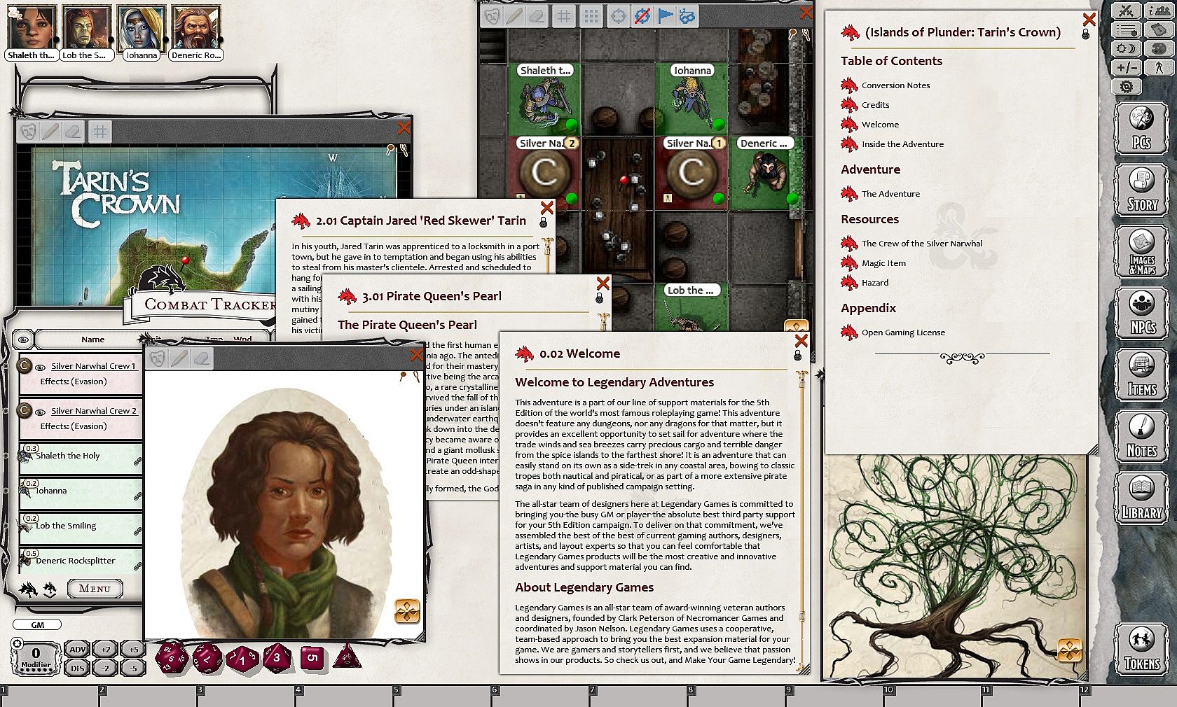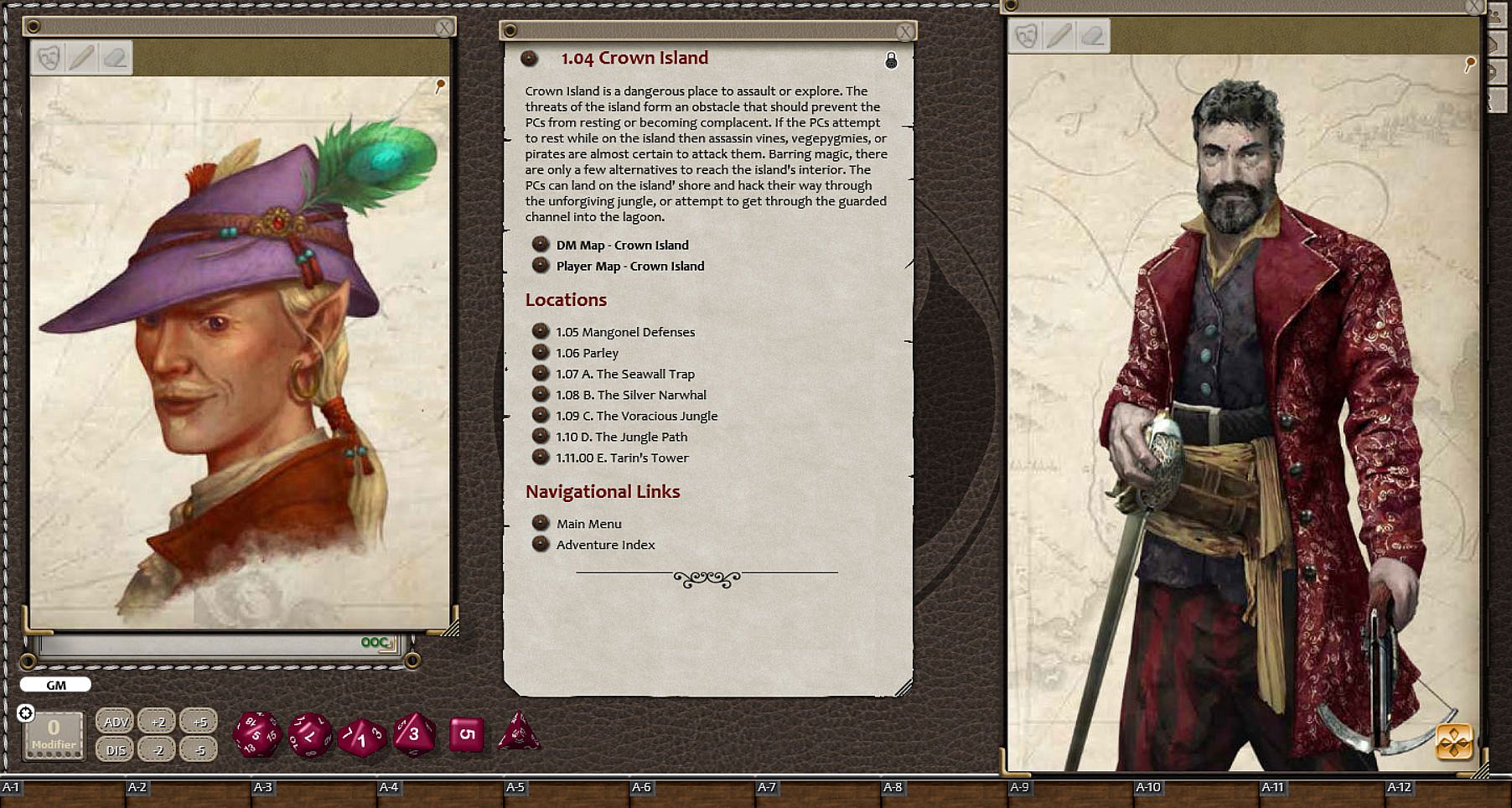 The treacherous jungle island known as Crown Isle was marked on every map for danger, as the verdant vegetation itself rose up to devour many who sought landing there until the infamous Captain Jared Tarin hacked out a refuge upon the mountain's hilly crest and made it his own. Other pirates sought to take him down, but each fell to the deadly dangers of the "Red Skewer" and his pirates, or to the still-wild jungle barely held at bay. When Tarin and his crew stole the Pirate Queen's Pearl, a flotilla of rivals blockaded his island for months, but none have dared to seize their chance. Can your eager band of buccaneers claim fame and fortune on the deadly isle of Tarin's Crown?