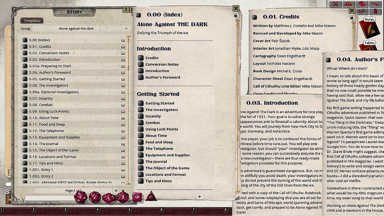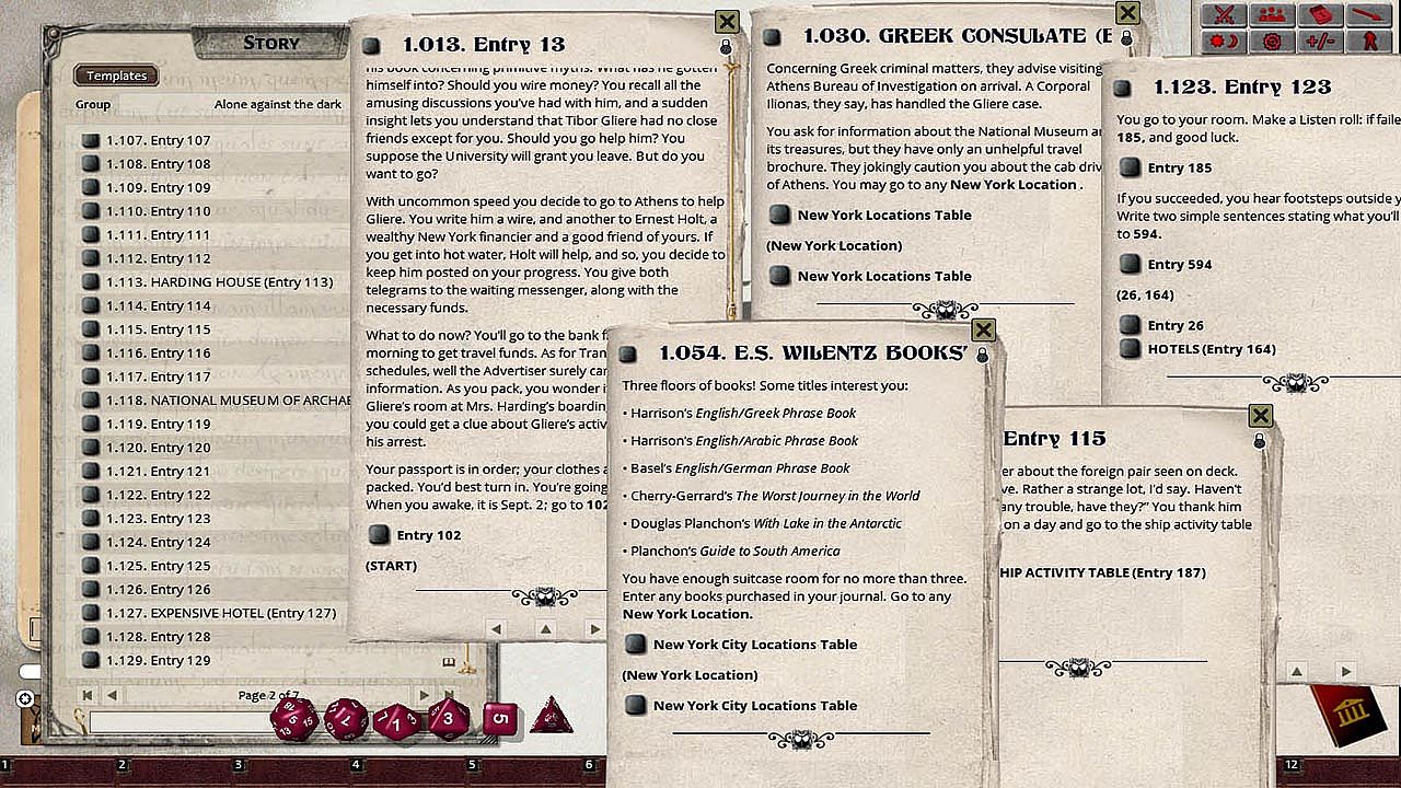 Alone Against The Dark is an adventure for one player, set in the fall of 1931. Your goal is to solve strange disappearances and to forestall a calamity about to beset the world. You will journey from New York City to Greece, Egypt, Germany, and Antarctica.