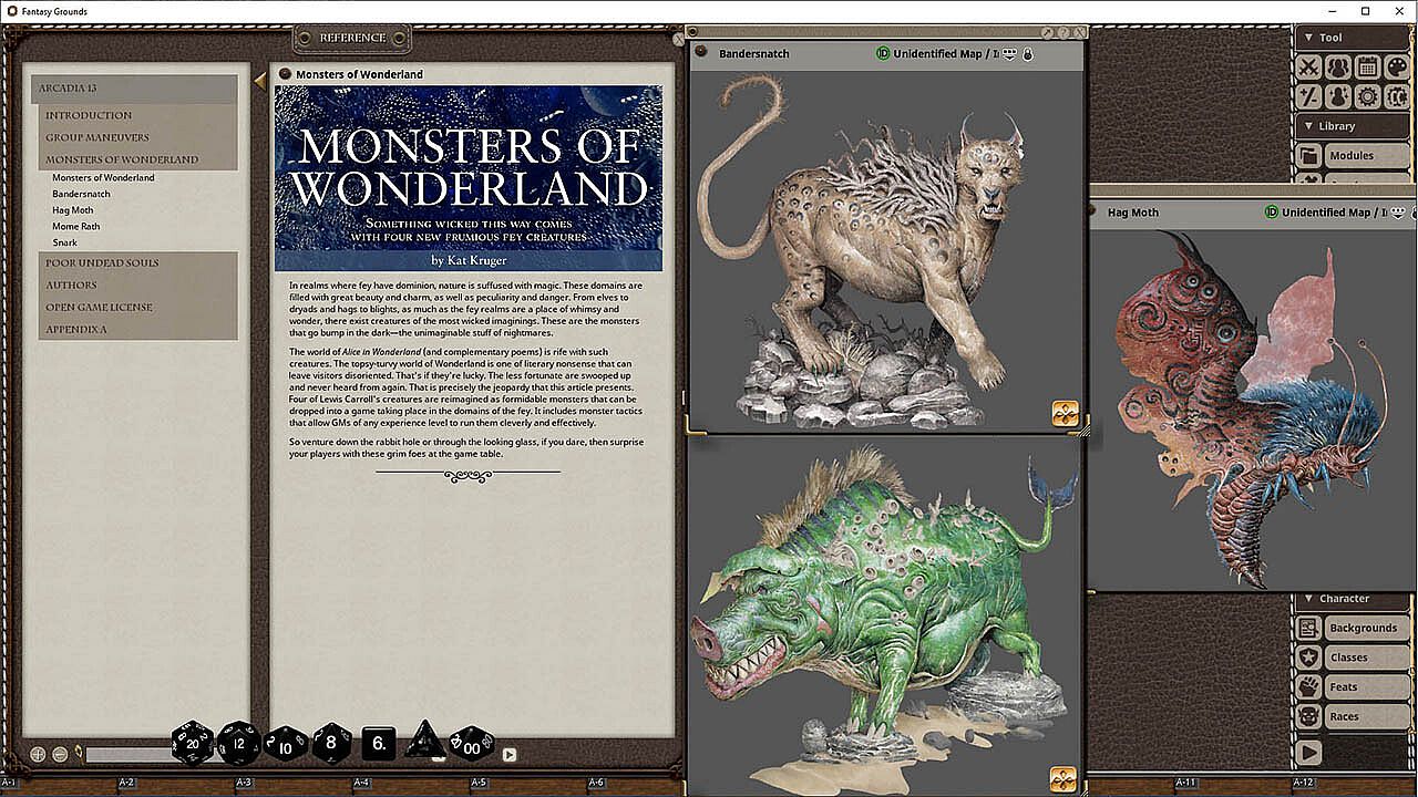 Monsters of Wonderland by Kat Kruger with art by Henrik Rosenborg. Inspired by the works of author Lewis Carroll, this article brings you new whimsical creatures to challenge your players with strange magical abilities. The bandersnatch, hag moth, mome rath, and snark come to life in these stat blocks, and they're not asking you to join a tea party.