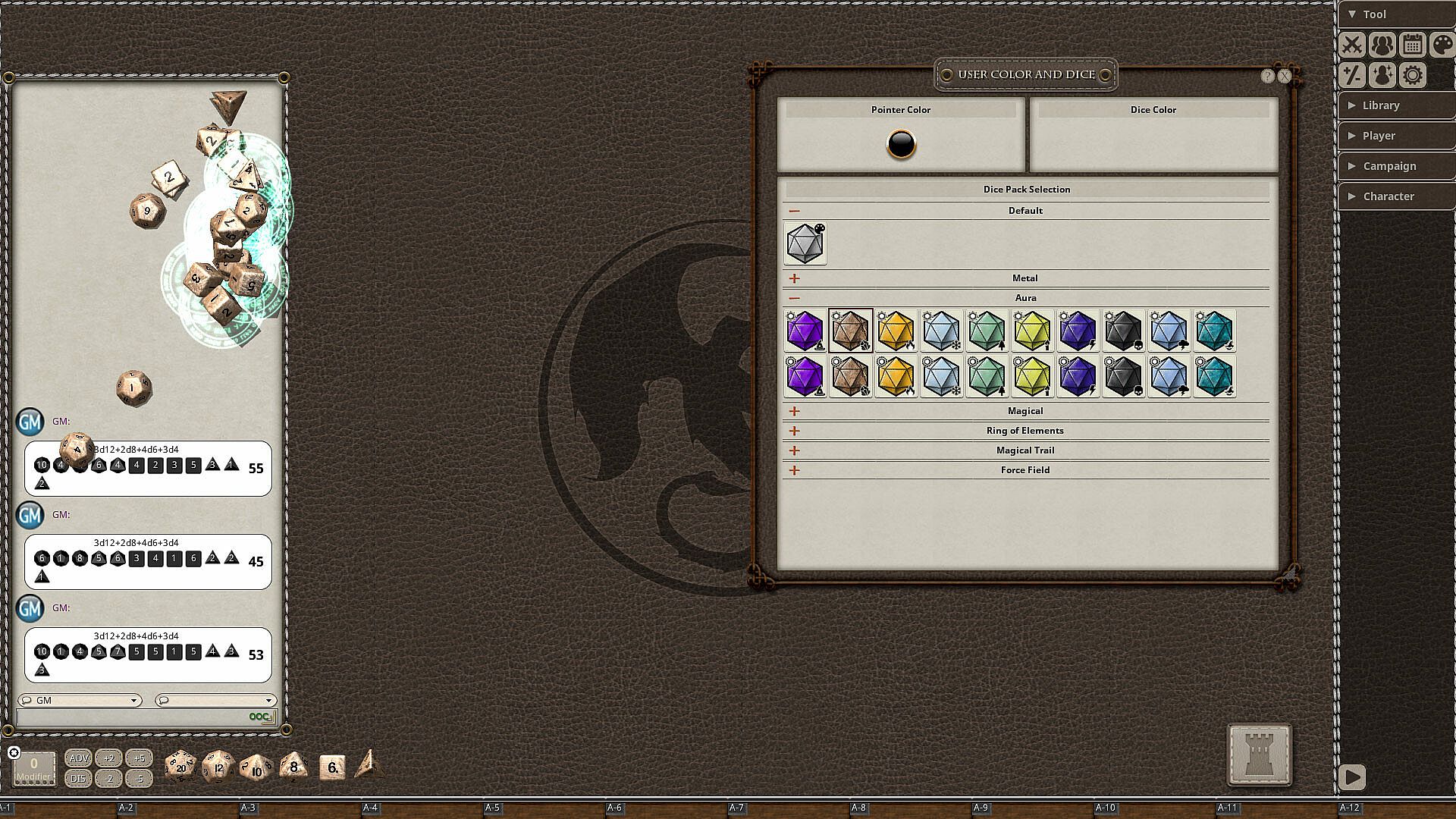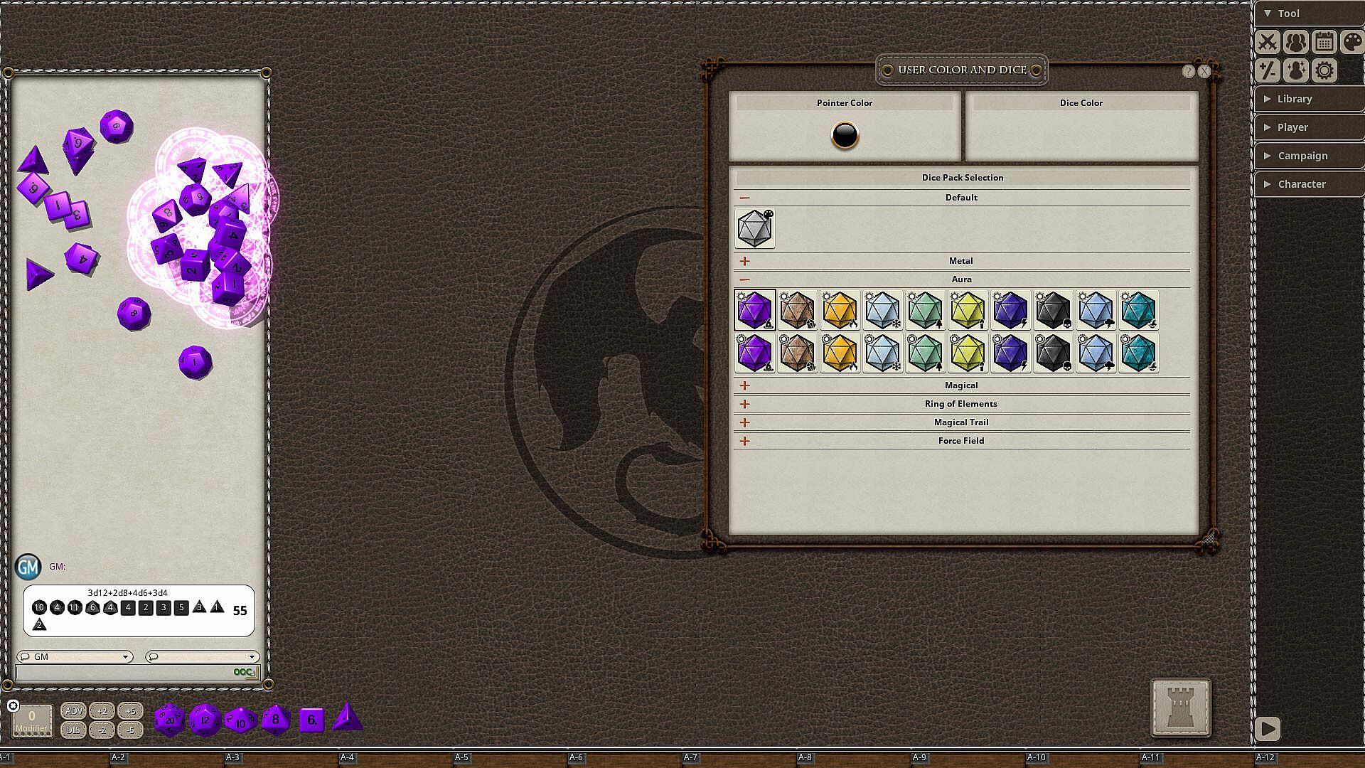 Add custom dice to your virtual tabletop and roll with style. These dice come in a variety of different colors and textures and they feature new animated effects that show up when you roll them. This pack includes the following 20 dice: