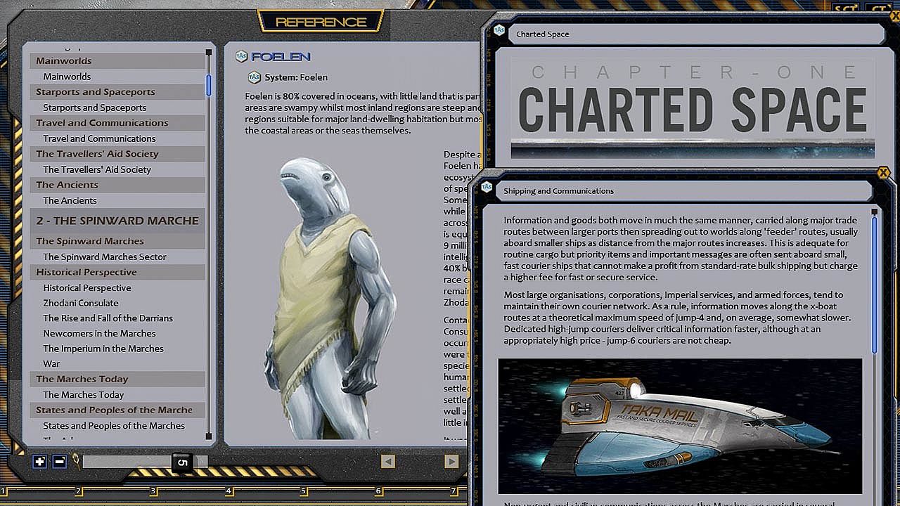 The Spinward Marches is a border region, caught between the Aslan Hierate and Zhodani Consulate, with the tumultuous politics of Deneb at its back. It is the gateway to the Imperial frontiers and the crossroads of internal and external politics. Adventure opportunities abound between the frontier worlds of the Marches and the trade hubs of Deneb. Far from the Imperial Core, fortune awaits the bold and disaster lurks for the unwary Traveller.