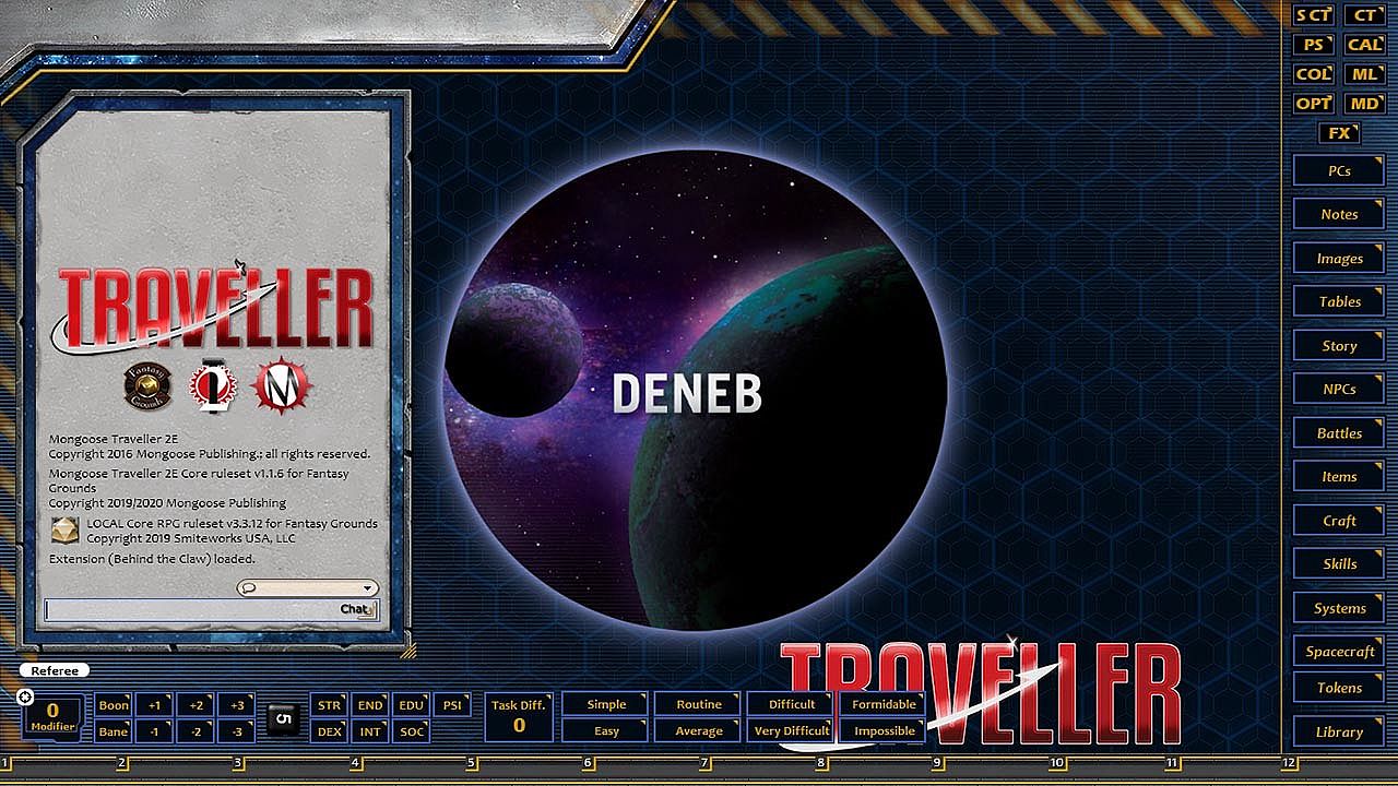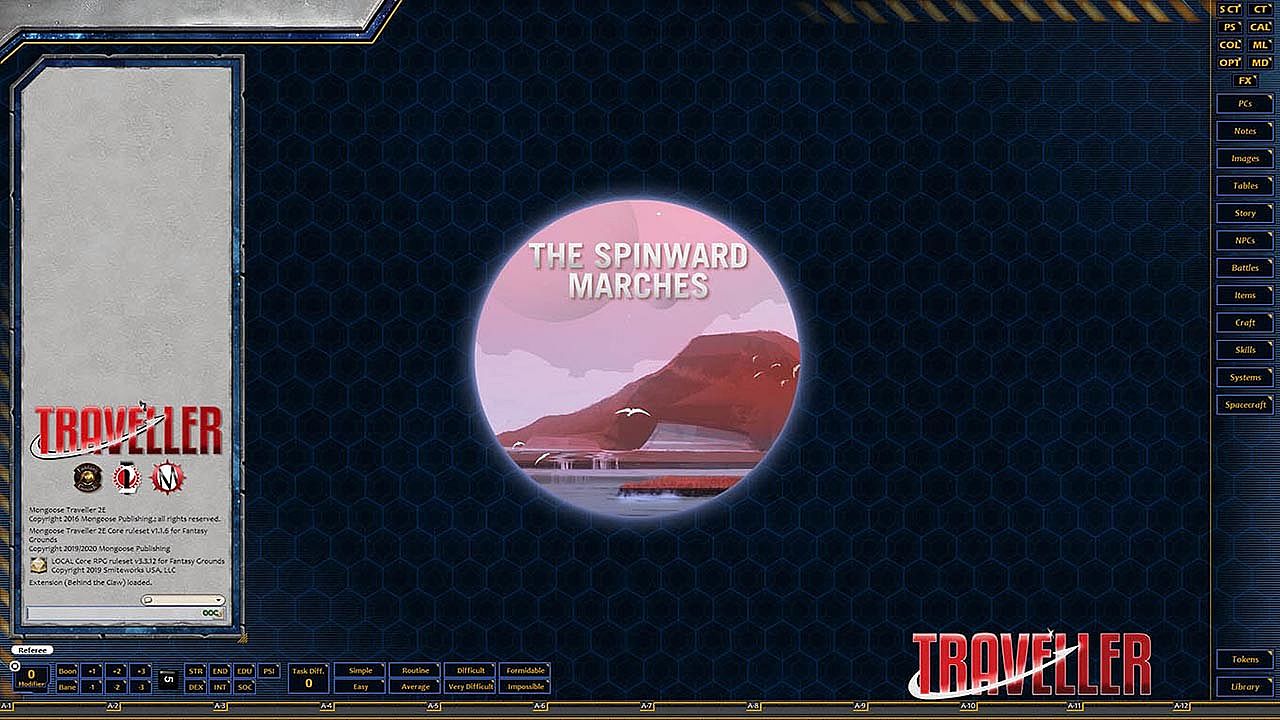 Requires: An active subscription or a one time purchase of a Fantasy Grounds Full or Ultimate license and a one time purchase of the Traveller 2E (Mongoose) ruleset. Compatible with Fantasy Grounds Unity or Fantasy Grounds Classic