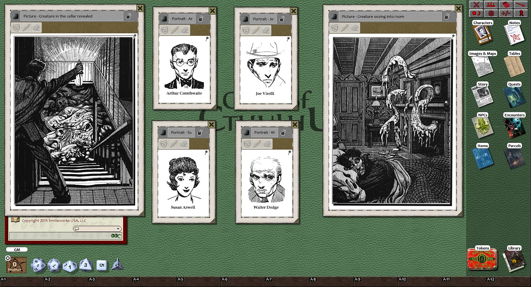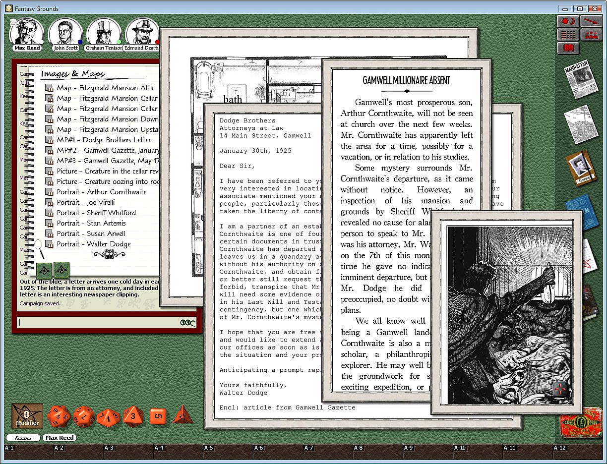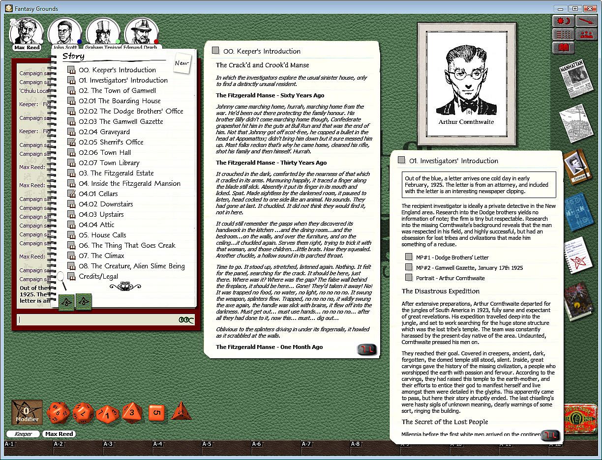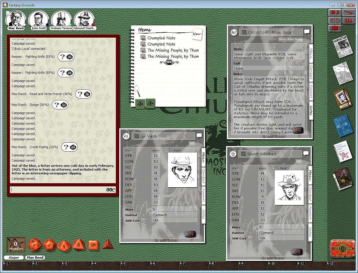 Requires: An active subscription or a one time purchase of a Fantasy Grounds Full or Ultimate licenses and a one time purchase of the Call of Cthulhu ruleset.