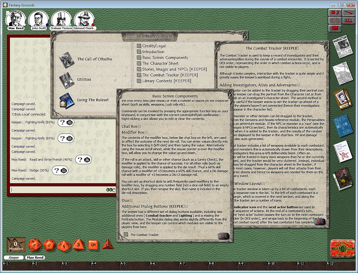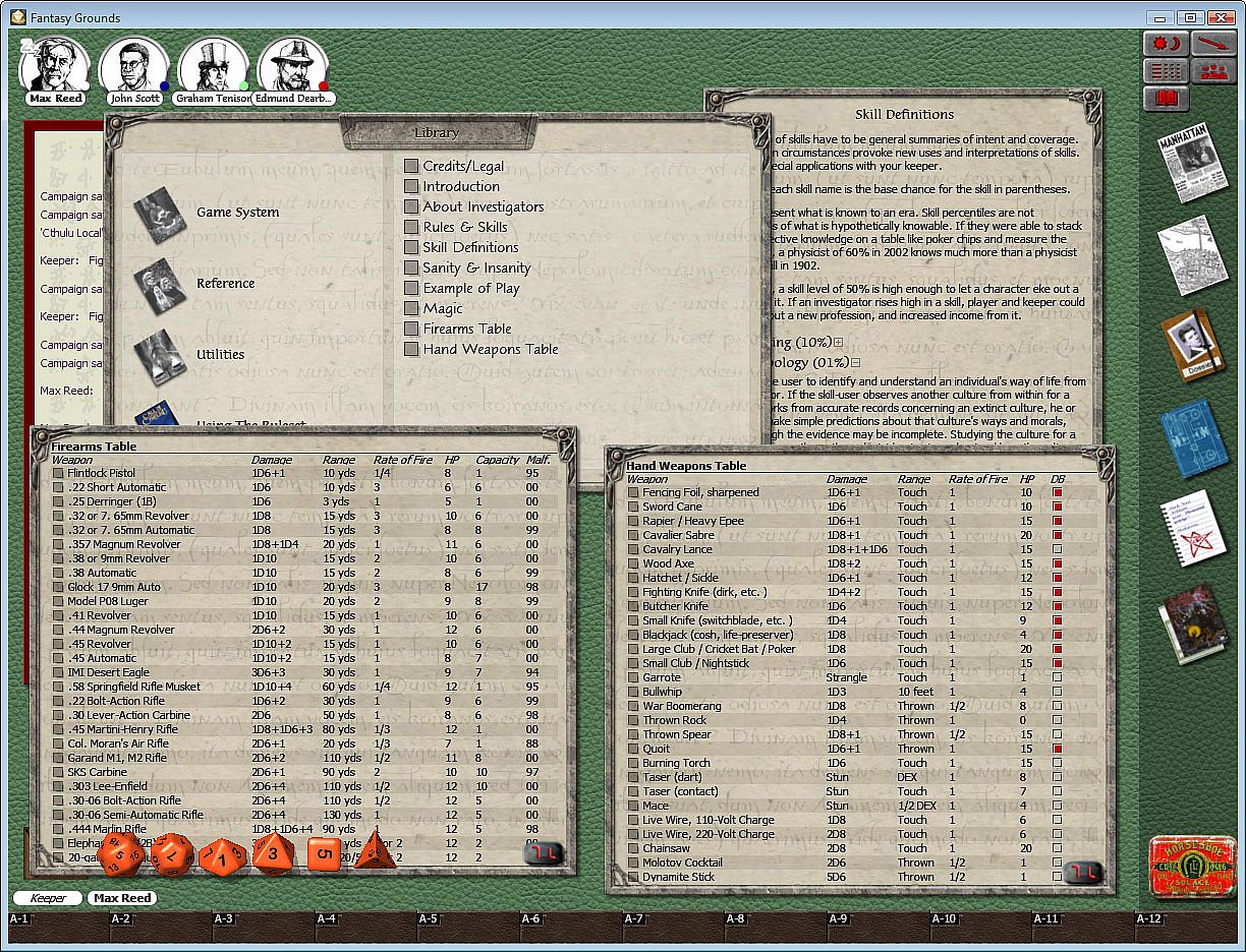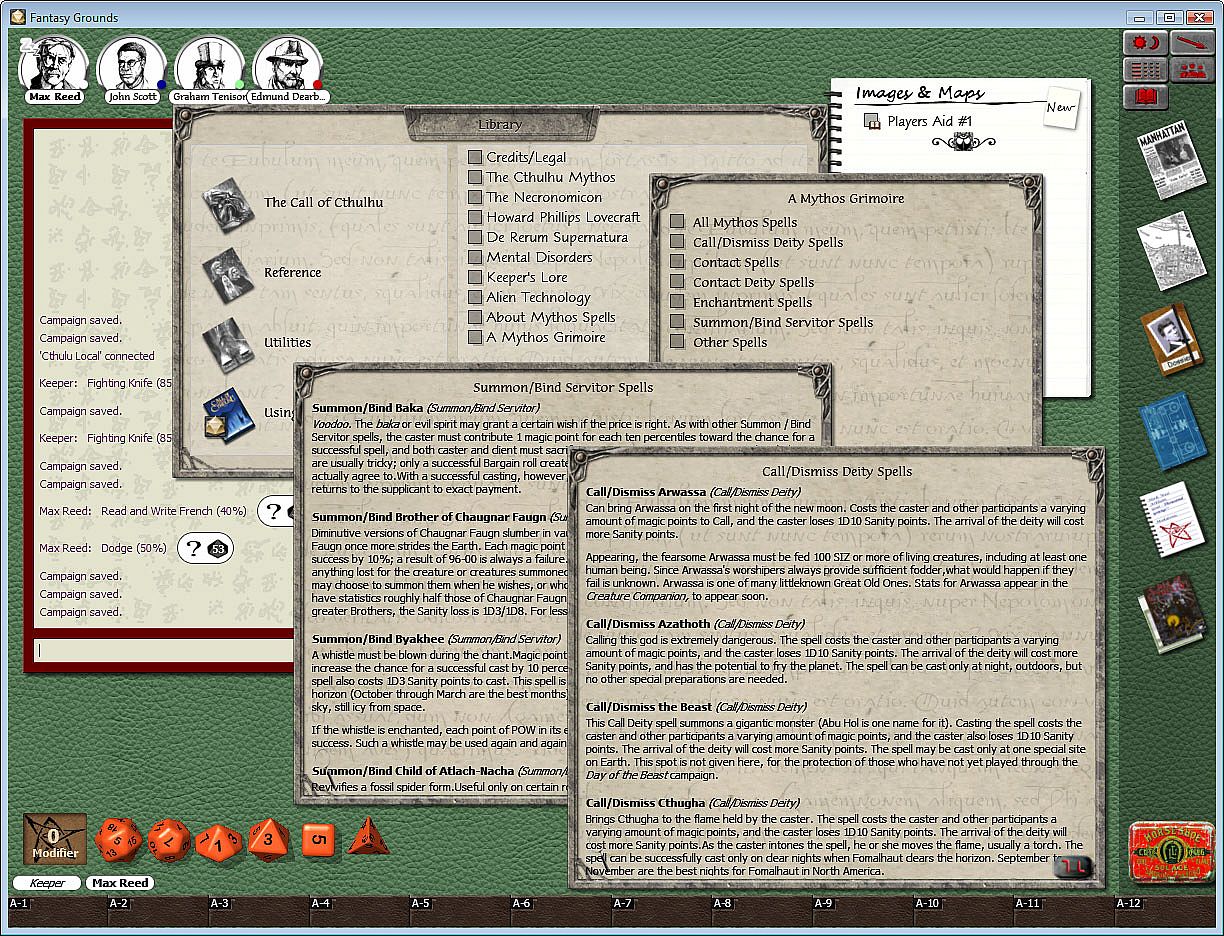 - The Fantasy Grounds software lets you enjoy Call of Cthulhu with friends across the world. This product includes Player reference material, skill lists and weapons tables in addition to Keeper material such as creatures of the Cthulhu Mythos to drag and drop straight into play, a combat tracker to make the most complex encounters run more smoothly, and hints and tips for running successful adventures.