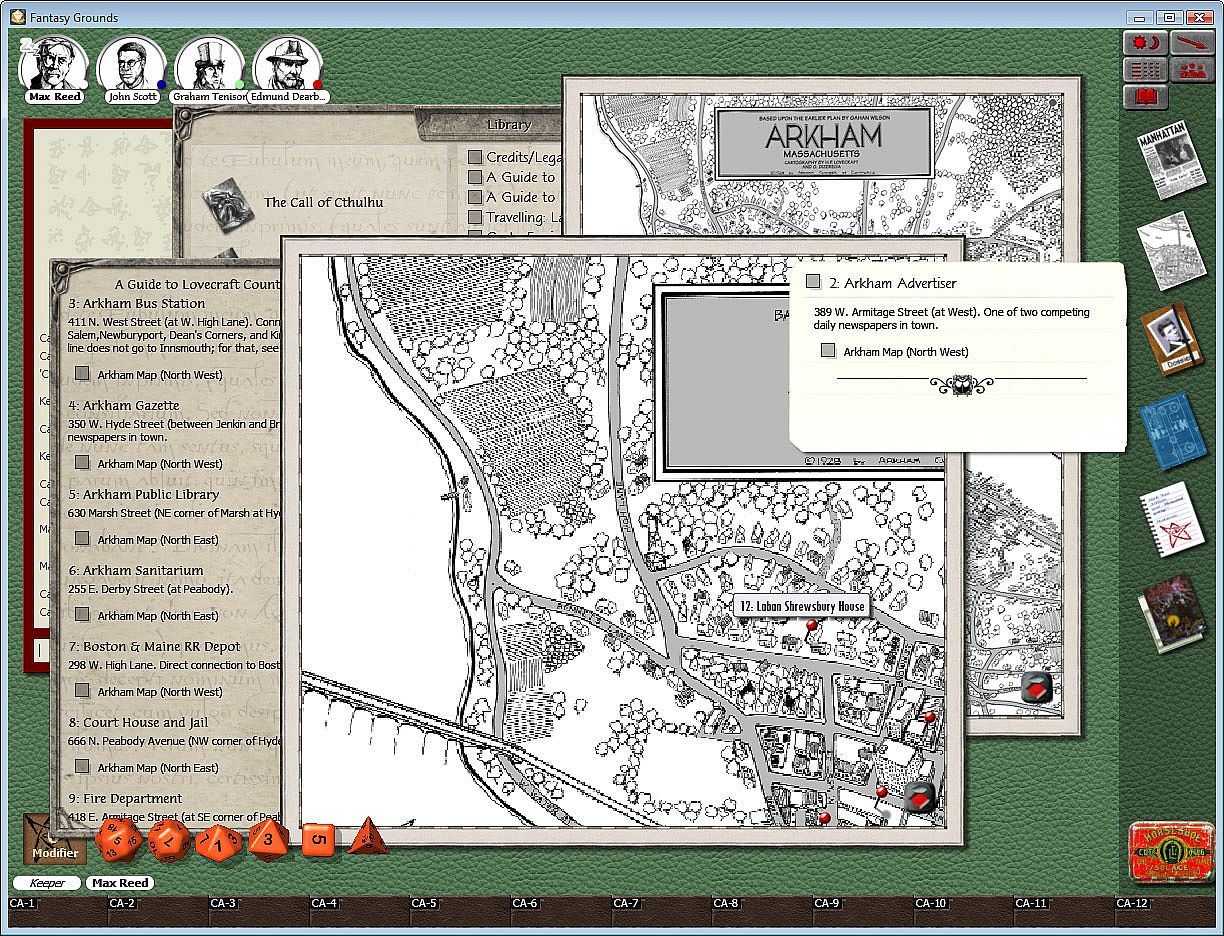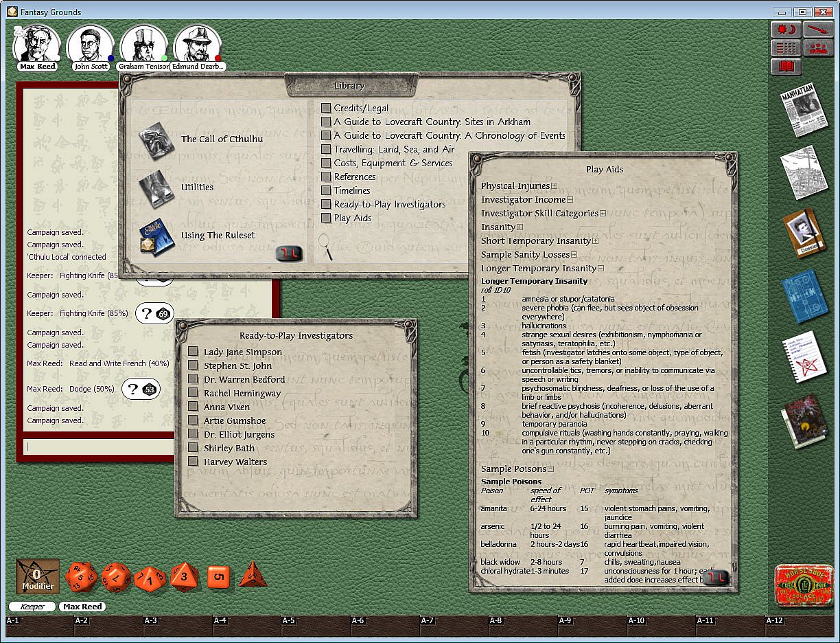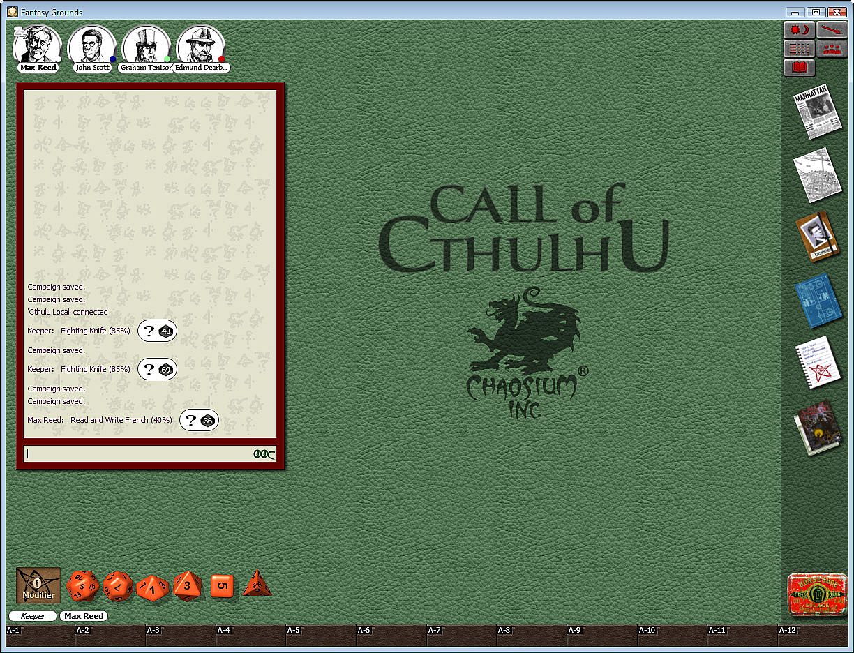 - The Fantasy Grounds software lets you enjoy Call of Cthulhu with friends across the world. This product includes Player reference material, skill lists and weapons tables in addition to Keeper material such as creatures of the Cthulhu Mythos to drag and drop straight into play, a combat tracker to make the most complex encounters run more smoothly, and hints and tips for running successful adventures.
