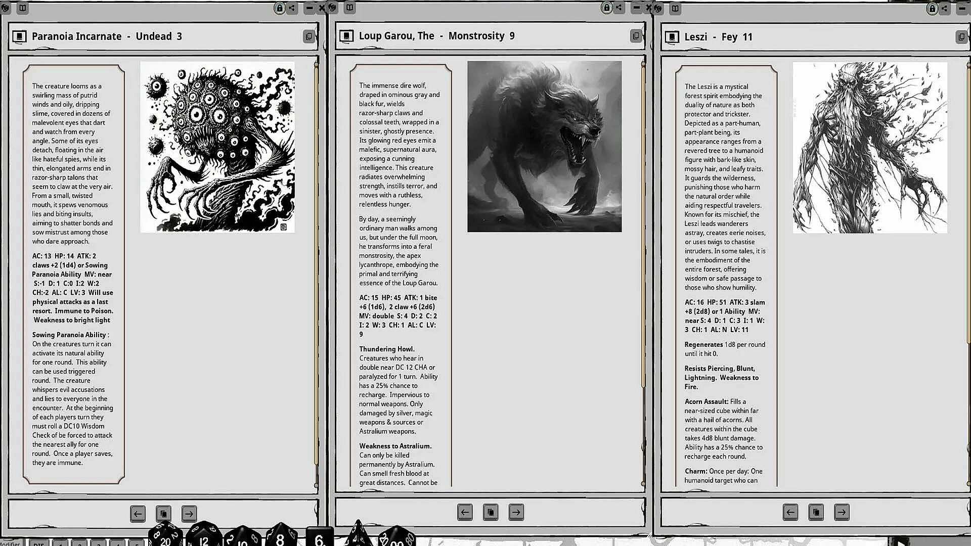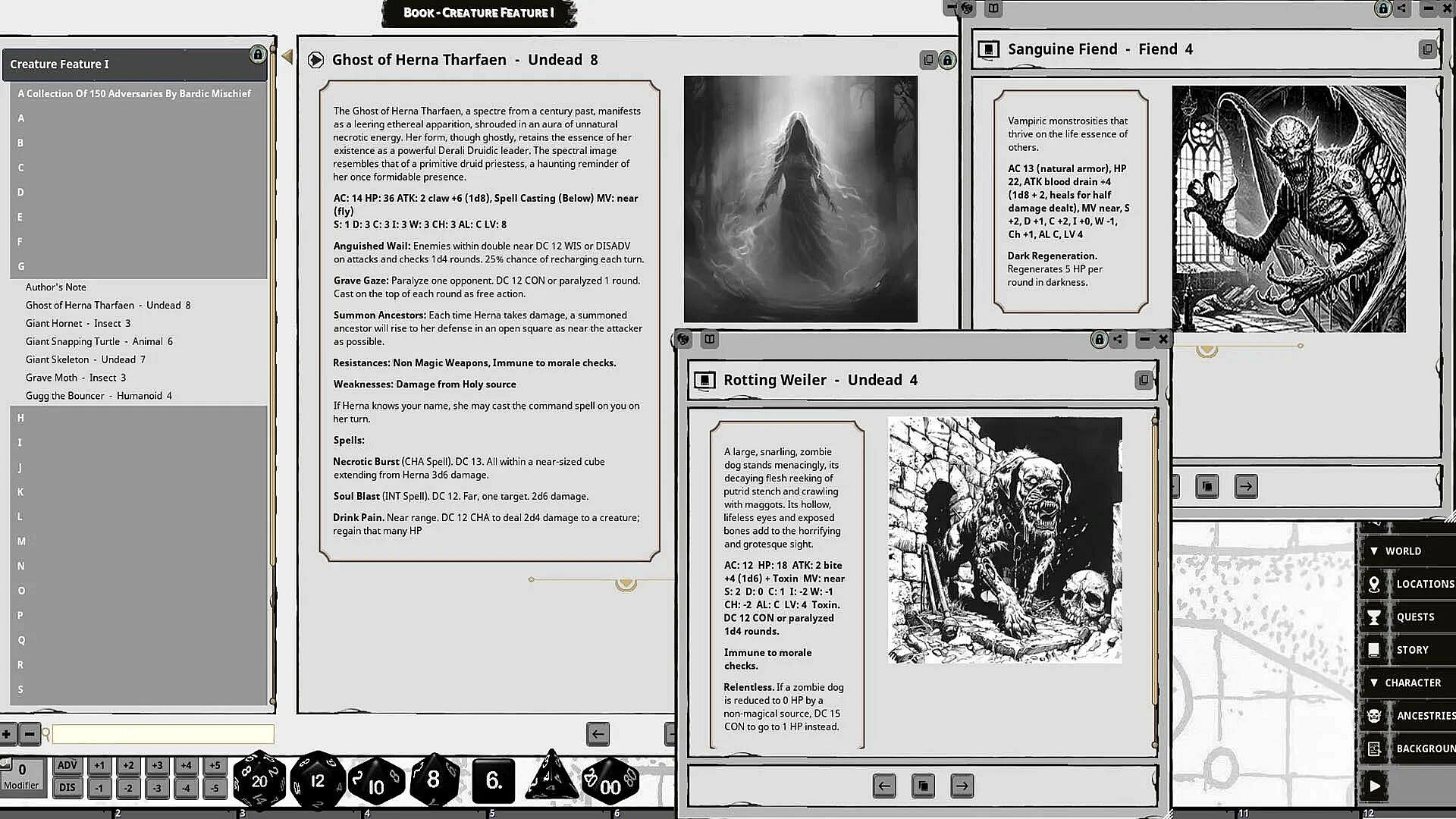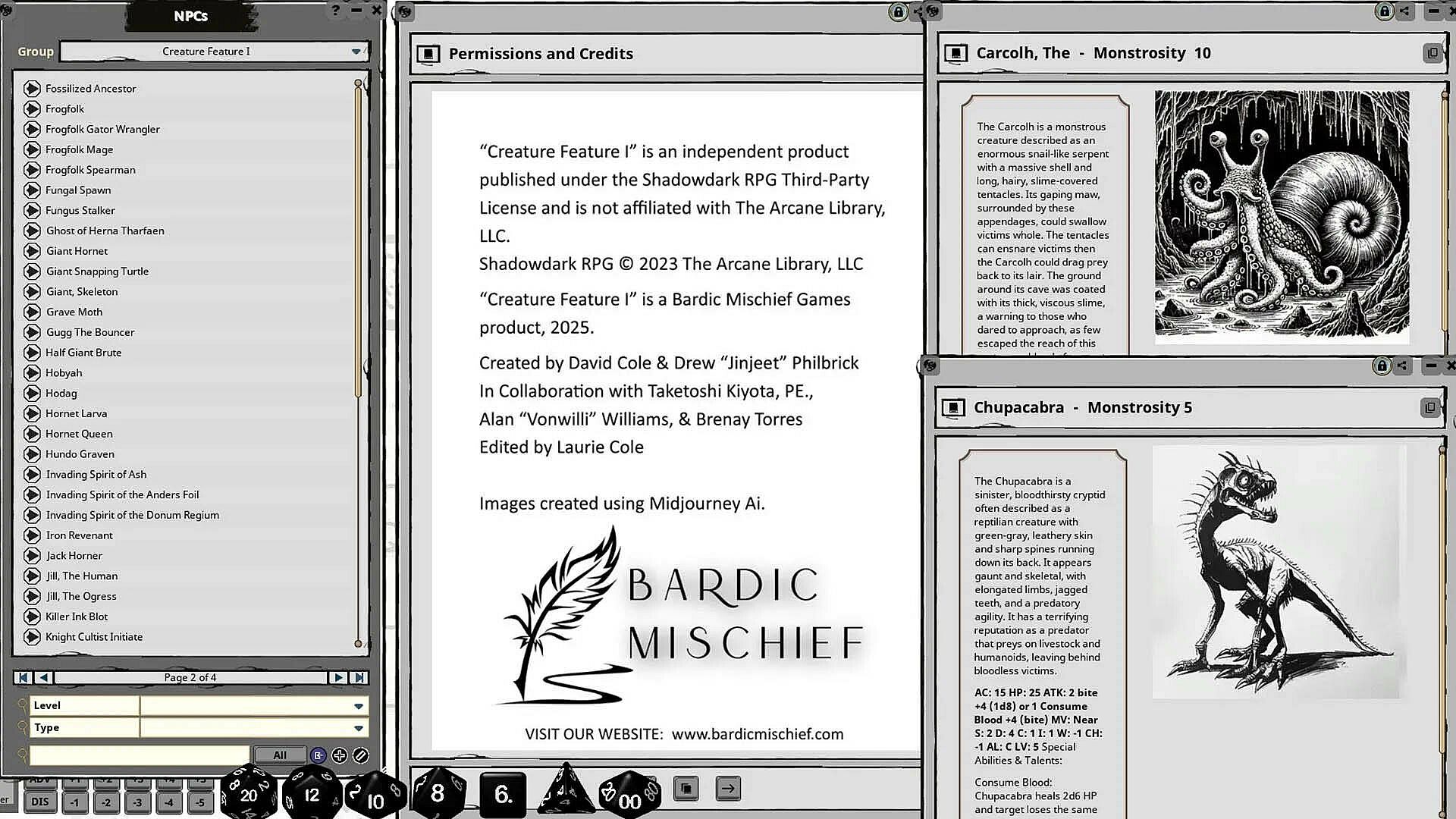 "The Creature Feature is a jam-packed compilation of creatures, monsters, and adversaries brought to life by Bardic Mischief in 2024. This collection blends iconic foes from past adventures with brand-new creations, each meticulously designed to spark imagination and challenge players. From the depths of perilous dungeons to the eerie echoes of gothic horror, these entries promise endless excitement for adventurers and dungeon masters alike. Compiled and narrated by the legendary rock 'n' roll bard Drewcifer Strumwell, this volume combines epic storytelling with monstrous mayhem and a large dose of humor, making it an essential addition to any adventurer's arsenal!"