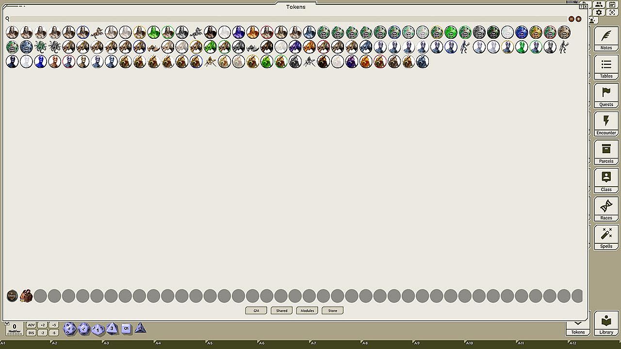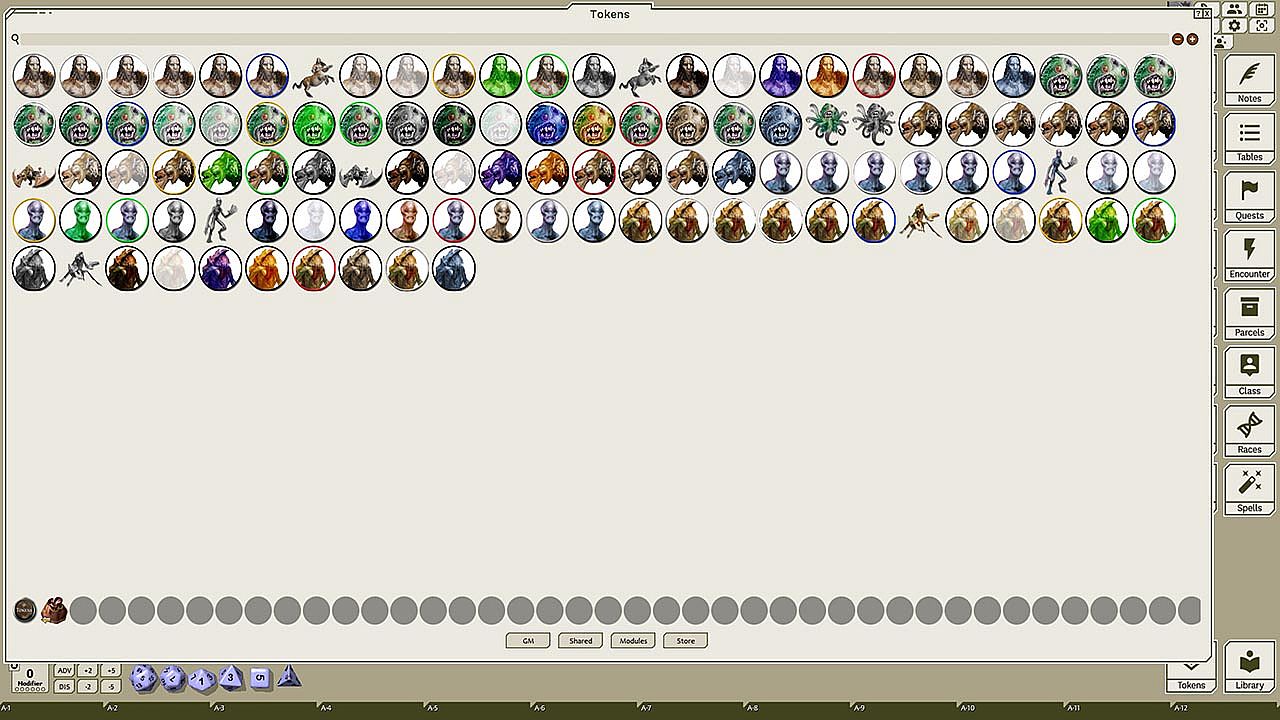 This token pack includes (ringed in black, blue, gold, green, greyscale, and silver):
