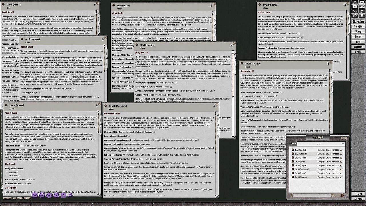 Druids love forests, true - but they love the arctic tundra, tropical rain forests, broad savannas, and fungi caverns of the Underdark, too. This 128-page accessory expands the living world of the druid in the AD&D 2nd Edition game, bringing new homes, character kits, personalities, spells, magical items, herbal lore, and a hundred details on druidic society, sacred groves, and high-level aspirations.This book has it all - don't leave the woods without it!